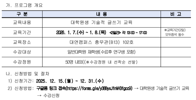 신청방법: 구글폼 링크 접속(https://forms.gle/y38ByxJfnVH3fgcc9) - 대학원생 기술적 글쓰기 교육 - 수강신청