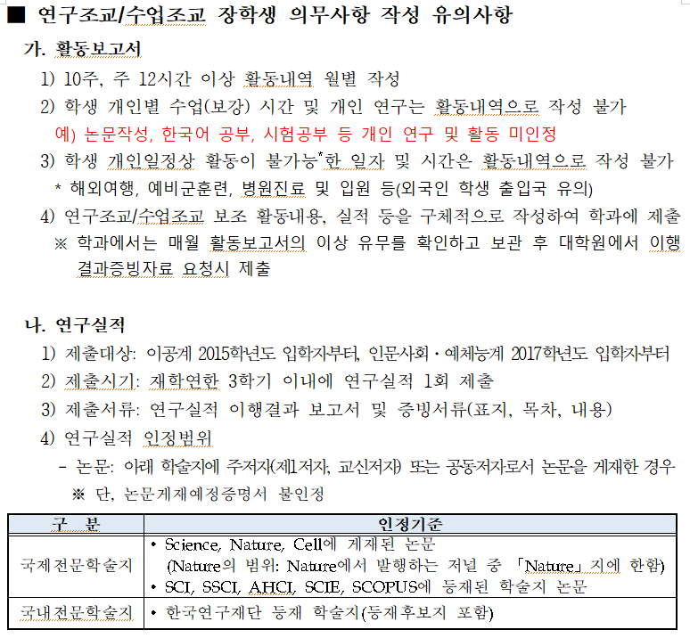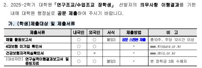 2025-2학기 대학원「연구조교/수업조교 장학생」 선발자의 의무사항 이행결과를 기한 내에 학과사무실로 제출하여 주시기 바랍니다