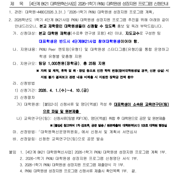 | 첨부파일 | [붙임1] [4단계 BK21 대학원혁신사업] 2026-1학기 PKNU 대학원생 성장지원 프로그램 계획(안).pdf [붙임2] 2026-1학기 PKNU 대학원생 성장지원 프로그램 신청명단 서식.xlsx [붙임3] 2026-1학기 PKNU 대학원생 성장지원 프로그램 제출양식.hwp [붙임4] PKNU 대학원생 성장지원 프로그램 신청서류 제출시 확인목록.hwp | ||