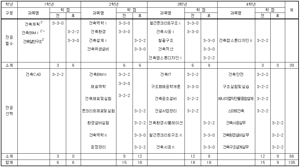 • 구조공학개론및실험(3-2-2) → 건축구조공학개론(3-3-0)(학점 및 명칭변경)