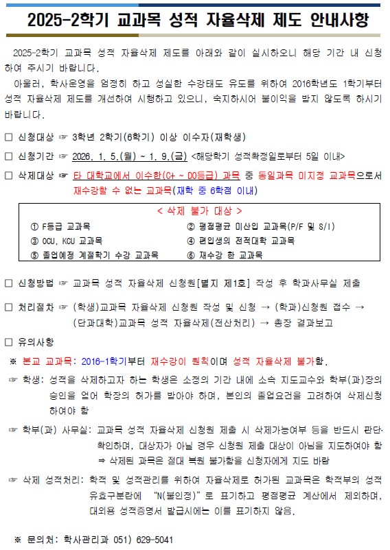 2025학년도 2학기 교과목 성적 자율삭제 시행 및 처리 안내