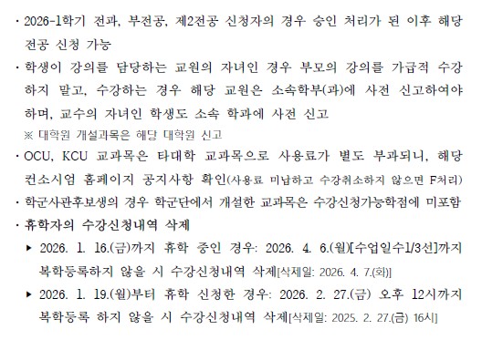 | 첨부파일 | 2026-1 예비수강신청 안내문.pdf 2026-1학기 강의편람.pdf 2026-1학기 수강신청 세부 추진일정.pdf 2026-1학기 개설교과목 현황(20260109 16시 기준)(안내용).xlsx | ||