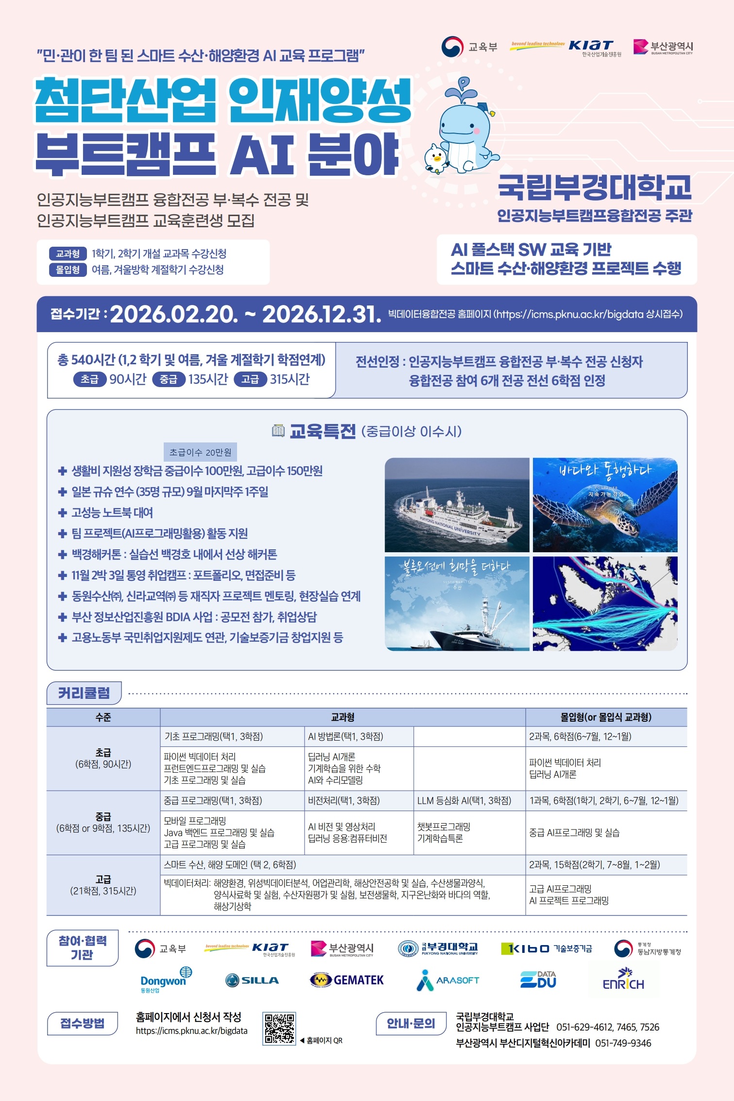 인공지능 부트캠프 교육생 모집 1. '26학년 1,2학기 여름, 겨울 계절학기 교과목 연계 2. 교육내용 : AI풀스택 SW교육 기반 스마트 수산해양 프로젝트 수행 - 초급(6학점, 90h) : 기초 프로그래밍, AI방법론 - 중급(6~9학점, 135h) : 풀스택 프로그래밍, 비전처리, LMM - 고급(21학점, 315h) : 수산해양 도메인, 풀스택프로젝트프로그래밍 4. 교육대상 : 학부생 5. 특전 - 융합전공 부/복수 전공 연계, 참여전공 전선 6학점 인정 - 초급이수 20만원, 중급이수 100만원, 고급이수 150만원 - 고성능 노트북 대여 - 규수대 1주일 연수(9월) - 2박 3일 통영 취업캠프(11월) - 참여기업 멘토링, 현장실습 연계 등 6. 모집기간 : ~2026.12.31. (상시모집) - 빅데이터 융합전공 홈페이지 인터넷 접수(https://icms.pknu.ac.kr/bigdata) 7. 문의 : ☎051-629-4612, 7465
