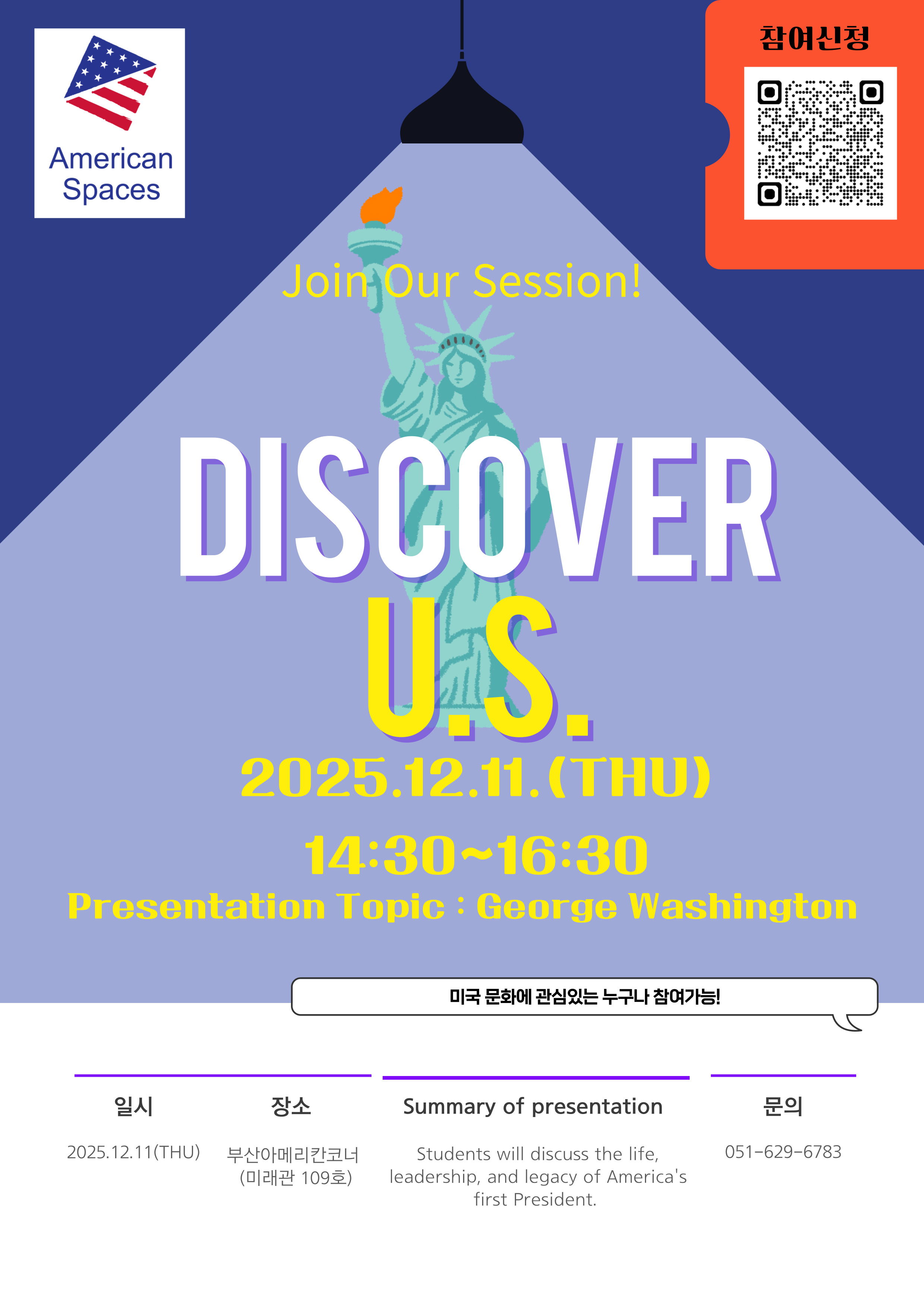 ★2025.12.11.(THU) Discover U.S. 프로그램 1st Session 참가 안내★ 미국 대사관에서 선발한 미국인 연사(그랜티)와 함께하는 미국 이야기! 미국 문화 및 한미 교류에 관심있는 누구나 참여가능합니다! • 일시: 2025년 12월 11일 (목) 오후 2시30분-오후 4시30분 • 장소: 국립부경대학교 대연캠퍼스 미래관 (A21) 109호 부산아메리칸코너 • 이번 주제: George Washington (the life, leadership, and legacy of America's first president) • 대상: 누구나 • 연사: Aaron Shayne 사전 접수 필수! [참여신청: https://forms.gle/etCFMkWQqm43i2gU6] 문의: 051-629-6783 |