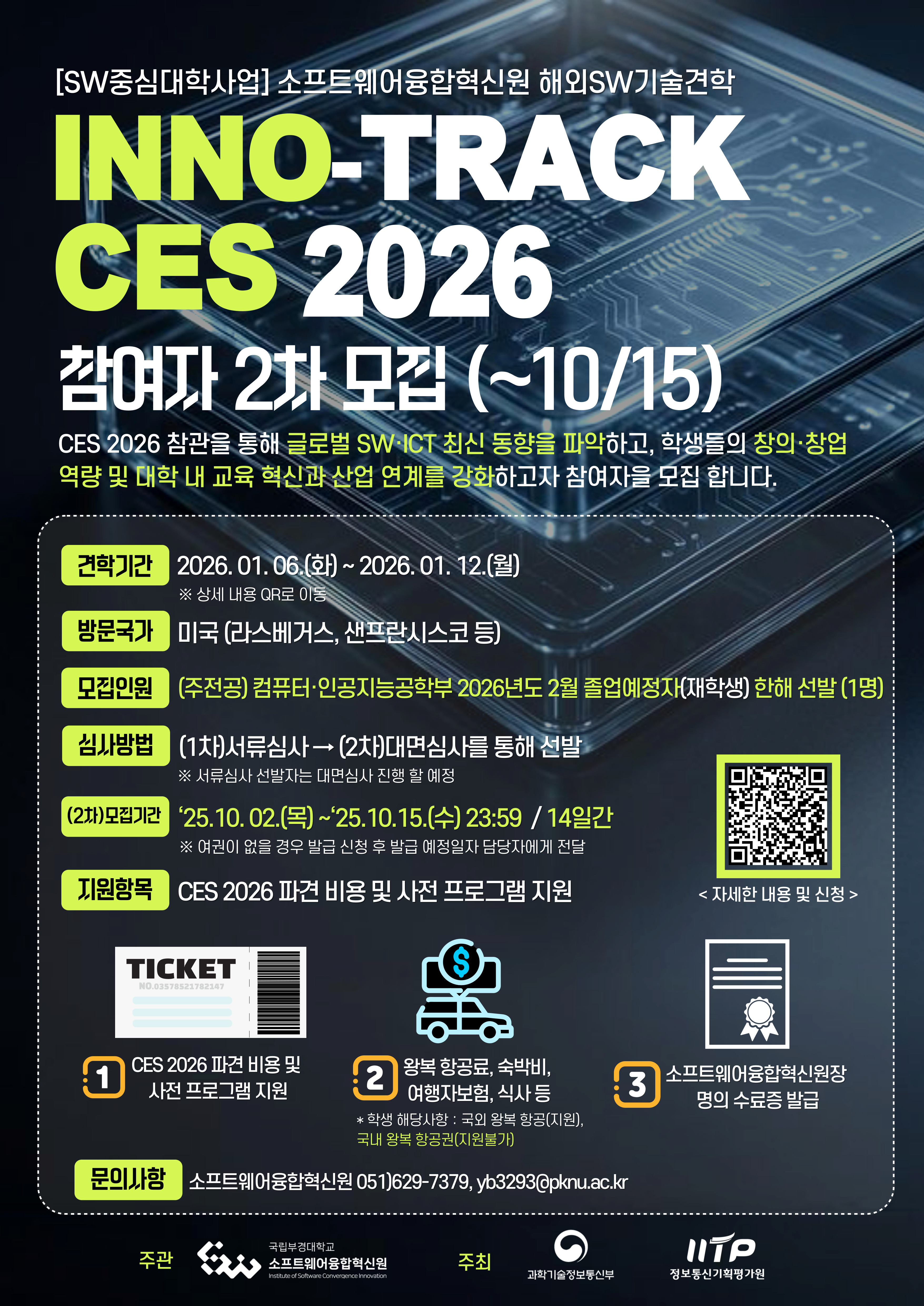 CES 2026 참관을 통해 글로벌 SW·ICT 최신 동향을 파악하고, 학생들의 창의·창업 역량 및 대학 내 교육 혁신과 산업 연계를 강화하고자 참여자을 모집 합니다.