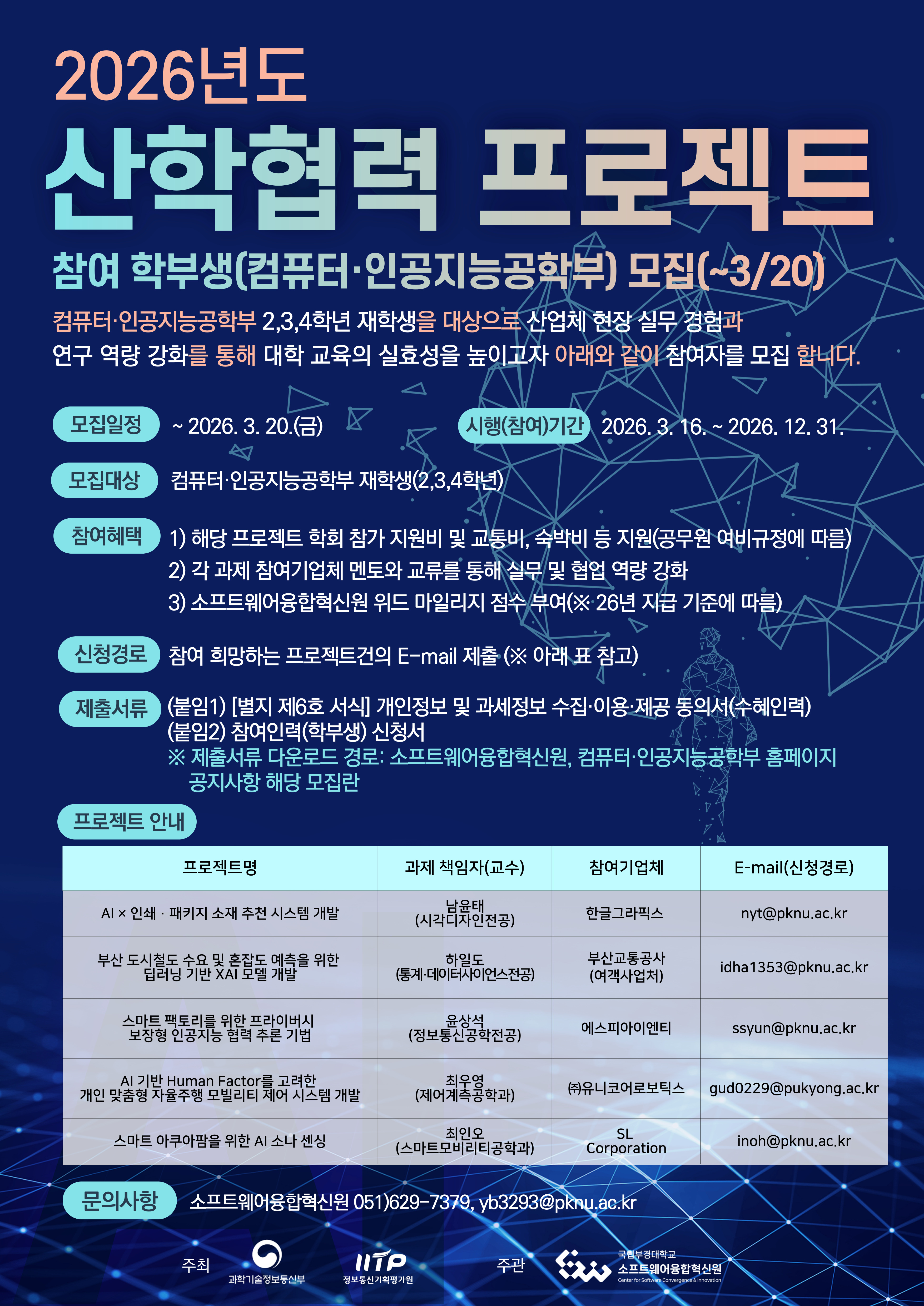 | [소프트웨어융합혁신원] 2026 산학협력 프로젝트 참여 학부생 모집(~3/20) | |||