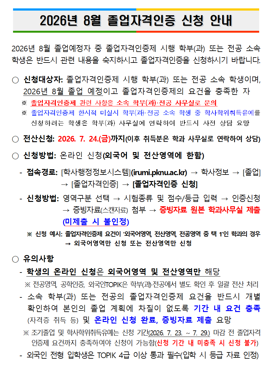 <2026년 8월 졸업생 적용 졸업자격인증 신청 안내> 1. 신청기간: ~ 2026.7.24. (금) 까지 2. 신청영역: 전공영역 (외국어, 전산영역 신청 필요 없음) 3. 신청방법: 전공영역 증빙서류 학과 사무실(자연과학1관 4층 5413호) 방문 제출 ※ 졸업자격인증제 자격 요건은 붙임파일 확인