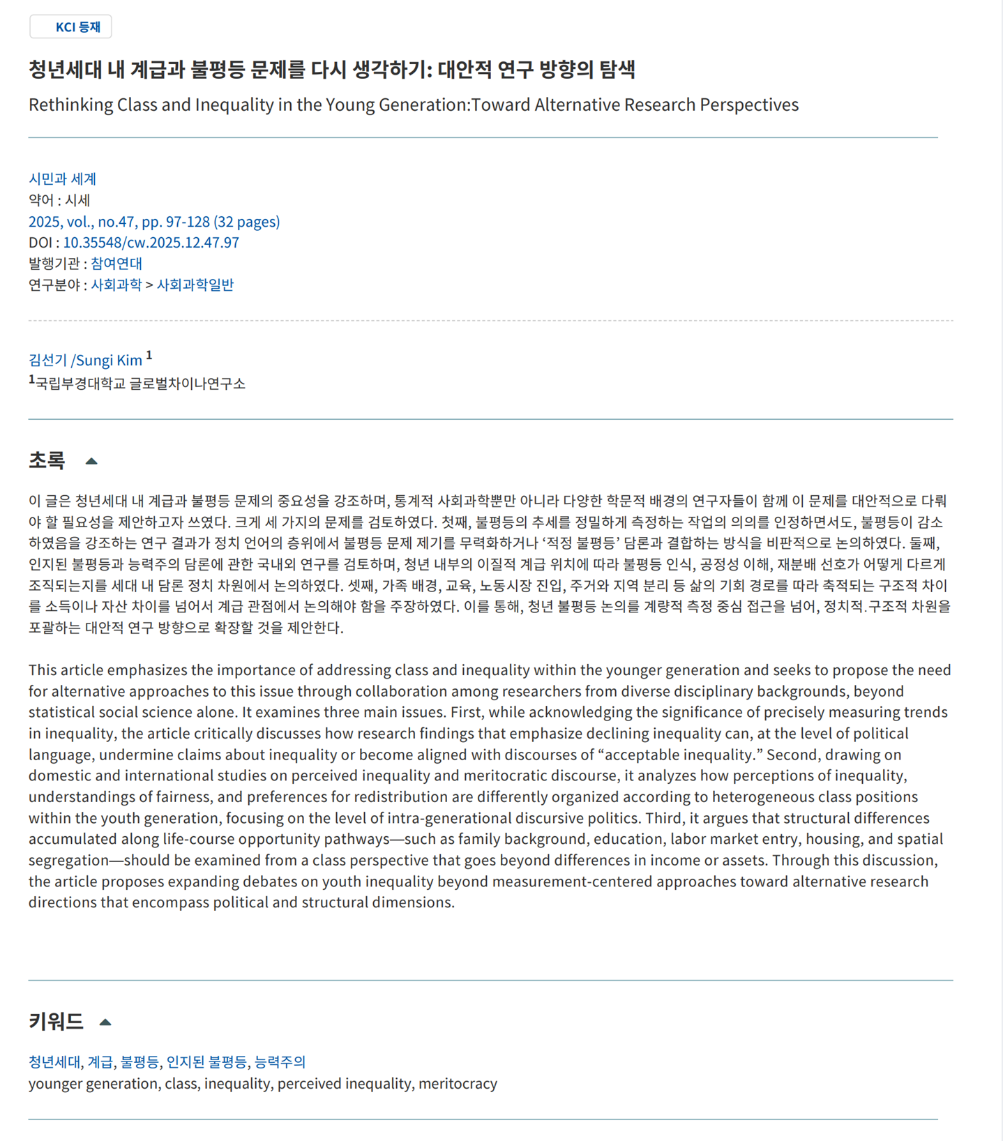 김선기. (2025). 청년세대 내 계급과 불평등 문제를 다시 생각하기: 대안적 연구 방향의 탐색. 시민과 세계, 47, 97-128. Sungi Kim. (2025). Rethinking Class and Inequality in the Young Generation:Toward Alternative Research Perspectives. 시민과 세계, 47, 97-128. DOI:http://doi.org/10.35548/cw.2025.12.47.97
