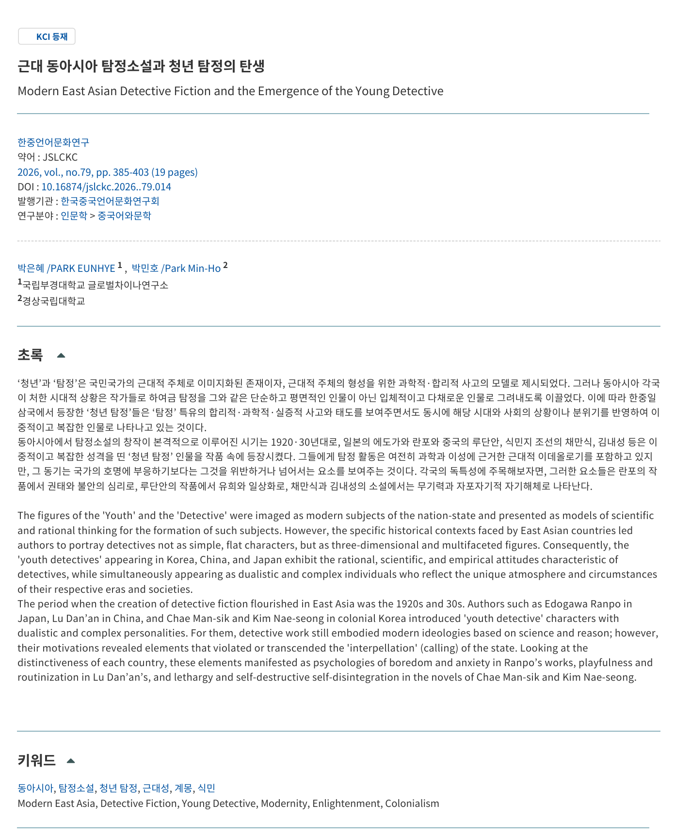 박은혜 and 박민호. (2026). 근대 동아시아 탐정소설과 청년 탐정의 탄생. 한중언어문화연구, 79, 385-403. PARK EUNHYE and Park Min-Ho. (2026). Modern East Asian Detective Fiction and the Emergence of the Young Detective. The Journal of Study on Language and Culture of Korea and China, 79, 385-403. DOI : 10.16874/jslckc.2026..79.014