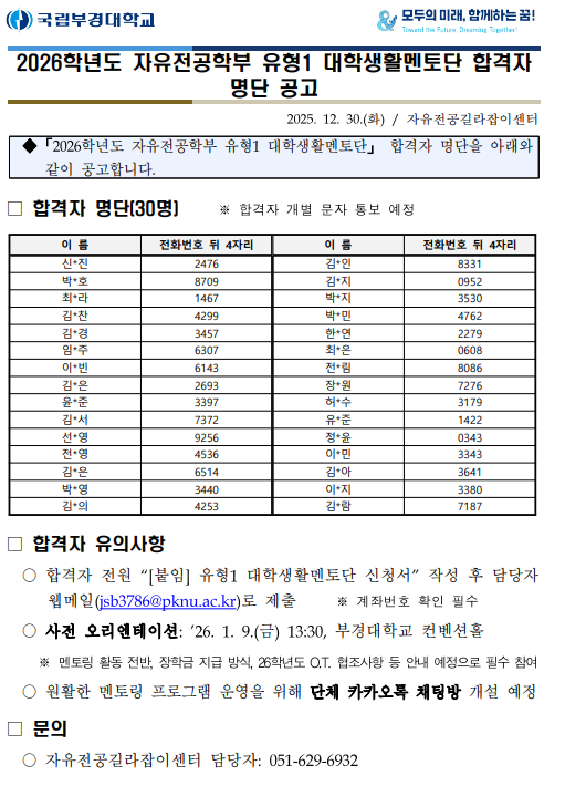 | 첨부파일 | [붙임1] 2026학년도 자유전공학부 유형1 대학생활멘토단 합격자 명단 공고.pdf [붙임2] 유형1 대학생활멘토단 신청서 서식.hwp | ||