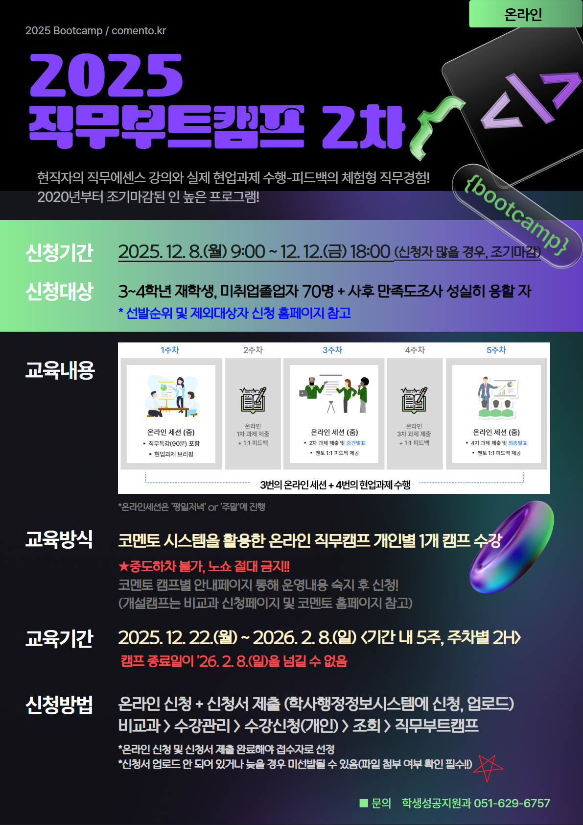 직무 심화 체험 기회를 위한「직무부트캠프 2차」모집 홍보 현직자의 현업 과제 수행 및 1:1 피드백을 통한 현업 이해도 제고 및 취업 경쟁력 강화 위한 온라인 교육을 실시하오니, 관심있는 학생들의 적극적인 참여 부탁드립니다. 가. 교육내용: 현직자 직무 엔센스 강의, Q&A 및 과제수행, 참여기간 내 직무캠프 중 1가지 선택 참여 (5주:주차별 2H, 온라인 교육) 나. 지원자격: 3~4학년 재학생, 미취업졸업자 다. 신청기간: 2025. 12. 8.(월) 9:00 ~ 2025. 12. 12.(금)까지 라. 교육방법: 코멘토 시스템을 활용한 온라인 교육 마. 신청방법: 국립부경대포털-부경AI-비교과(웨일비)-「직무부트캠프 2차」신청