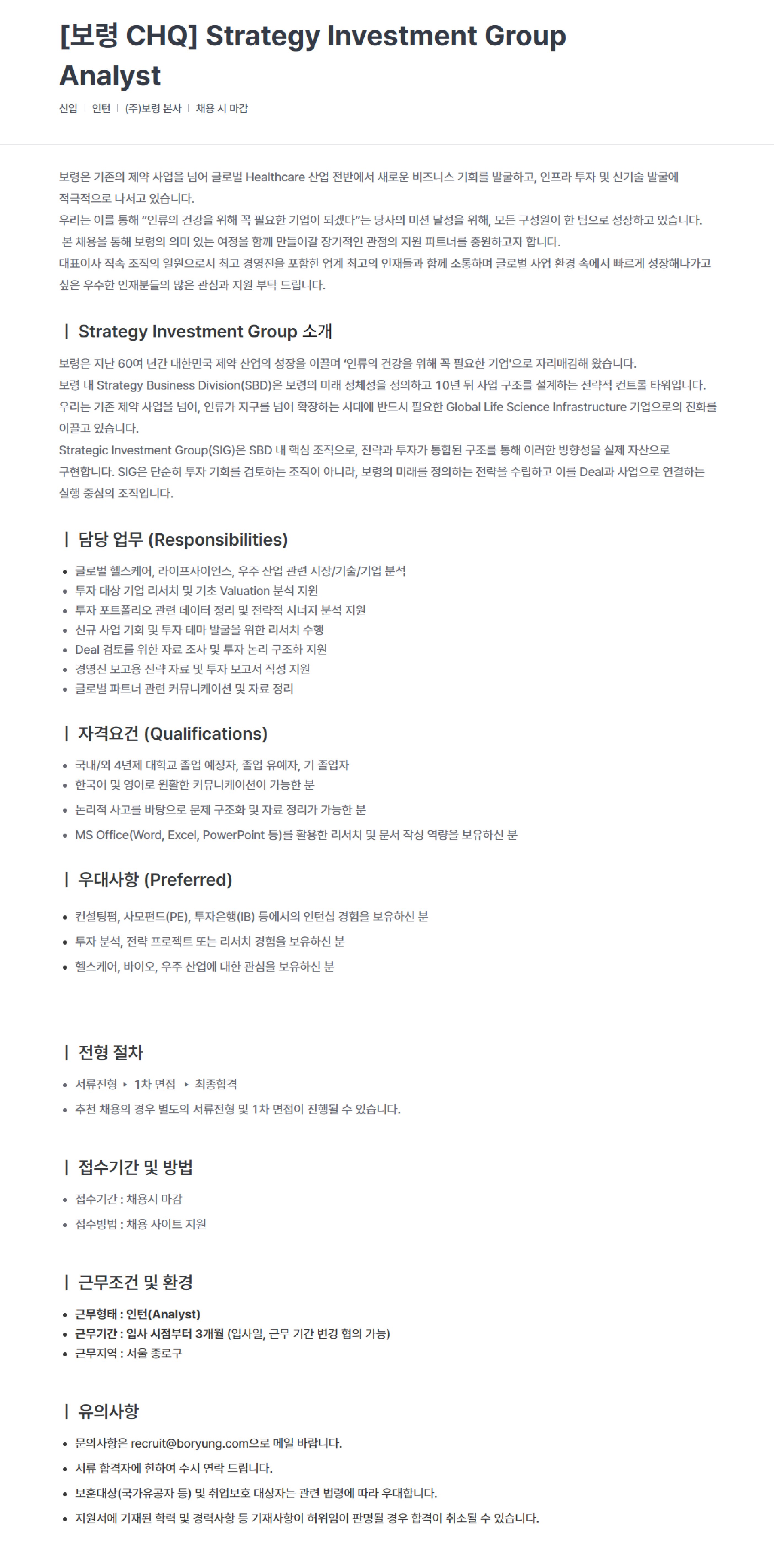 본 채용을 통해 보령의 의미 있는 여정을 함께 만들어갈 장기적인 관점의 지원 파트너를 충원하고자 합니다. 대표이사 직속 조직의 일원으로서 최고 경영진을 포함한 업계 최고의 인재들과 함께 소통하며 글로벌 사업 환경 속에서 빠르게 성장해나가고 싶은 우수한 인재분들의 많은 관심과 지원 부탁 드립니다.