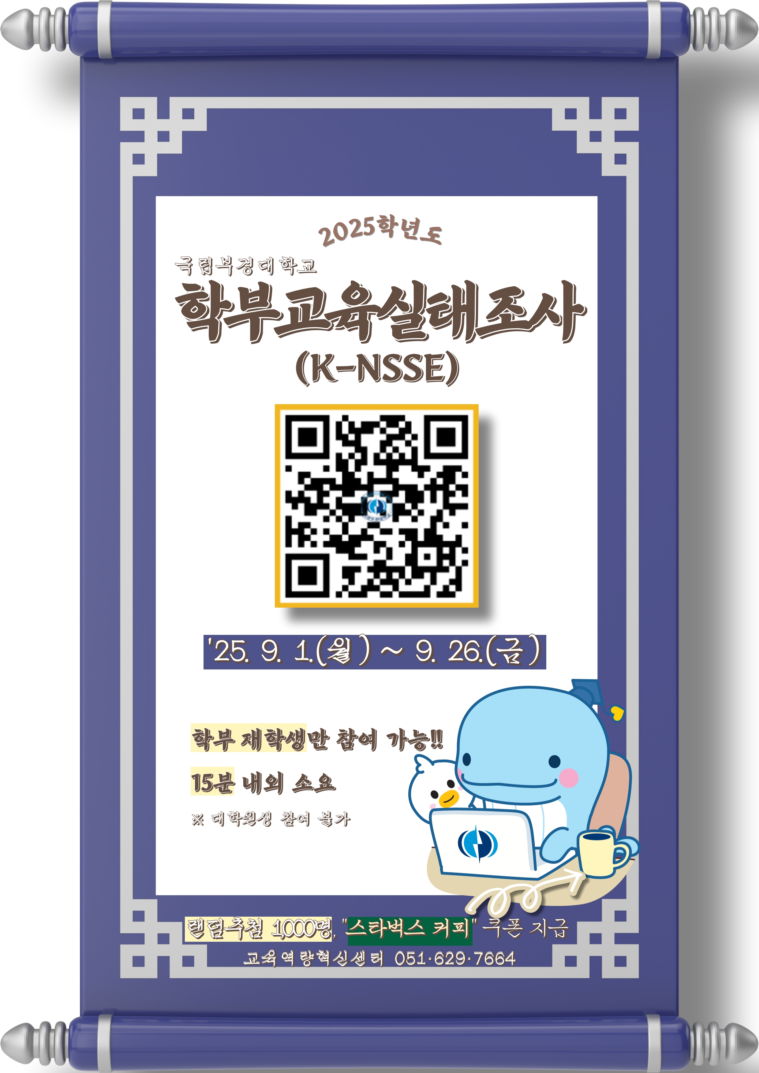 2025학년도「학부교육 실태조사(K-NSSE)」 교육역량혁신센터에서는 우리 대학의 학부교육의 질과 성과요인 탐색·분석을 위한 「2025년 학부교육 실태조사(K-NSSE)」를 실시하고 있습니다. 본 설문을 바탕으로 대학 교육성과 분석 및 교육정책 수립을 위한 사전분석 기초자료로 활용하고자 하오니, 많은 학생분들의 참여 부탁드립니다. 가. 조사명: 2025학년도 학부교육 실태조사(K-NSSE) 나. 조사목적: 타 대학과의 비교를 통한 우리 대학의 학습경험 질과 성과 측정·분석으로 교수·학습 및 비교과 프로그램 개선에 환류하여 교육의 질 제고 다. 설문개요 1) 설문 대상: 본교 학부 재학생 전체 2) 설문 기간: '25. 9. 1.(월) ~ 9. 26.(금) 3) 설문 방법: PC 웹 및 모바일을 활용한 온라인 조사(소요시간 15분 내외) - URL 주소 https://surveyl.ink/KNSSE_PKNU_2025 4) 조사 영역: 학업관련, 인간관계, 심리특성, 학업성과, 고효과 프로그램 참여 등 5) 참여 혜택: 조사 완료자(랜덤추첨 1,000명) 대상, 스타벅스 모바일 커피 쿠폰 지급 ※ 설문 마지막 문항에 개인정보 정확히 기입 필수(답례품 증정 시 필요), 불성실한 응답자 제외 라. 협조사항: 학부(과)·전공별 최소 50명 이상, 학년 및 성별이 고르게 참여할 수 있도록 협조 요망 ※ 학부(과)게시판, 문자메시지, 카카오톡 및 인스타그램 등 SNS을 통한 설문링크 안내 및 적극 홍보 마. 문의사항: 교육역량혁신센터(내선 7664)