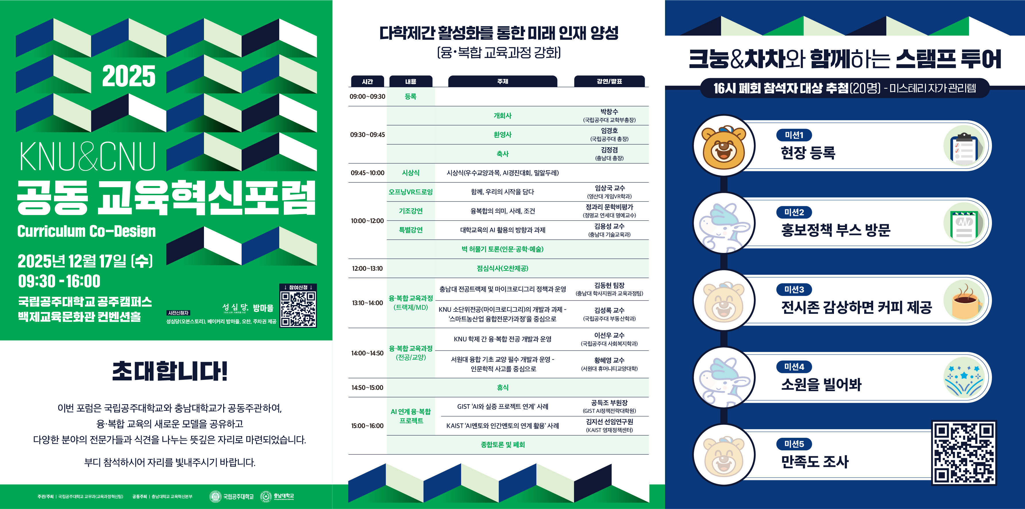 국립공주대학교 교무과와 충남대학교 교육혁신본부가 공동으로 「2025 knu & cnu 공동 교육혁신 포럼」을 개최하오니 관심 있는 분들은 기한 내 신청하시기 바랍니다. 가. 행 사 명: 2025 knu & cnu 공동 교육혁신 포럼 나. 포럼주제: 다학제간 활성화를 통한 미래 인재 양성(융·복합 교육과정 강화) 다. 참석대상: 전국 대학 관계자, 교직원 및 학생 등 라. 행사개요: 행사 세부 일정은 붙임 안내포스터 참고