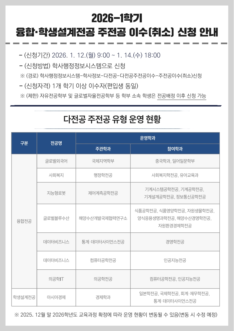 2026학년도 1학기 융합·학생설계전공 주전공 이수자 선발계획을 아래와 같이 알려드리오니, 관심있는 학생들은 신청바랍니다. 가. 선발대상: 1개 학기 이상 이수자(편입생 동일) ※ (제한) 자유전공학부 및 글로벌자율전공학부 등 학부 소속 학생은 전공배정 이후 신청 가능 나. 모집기간: 2026. 1. 12.(월) 9:00 ~ 1. 14.(수) 18:00까지 다. 추진일정