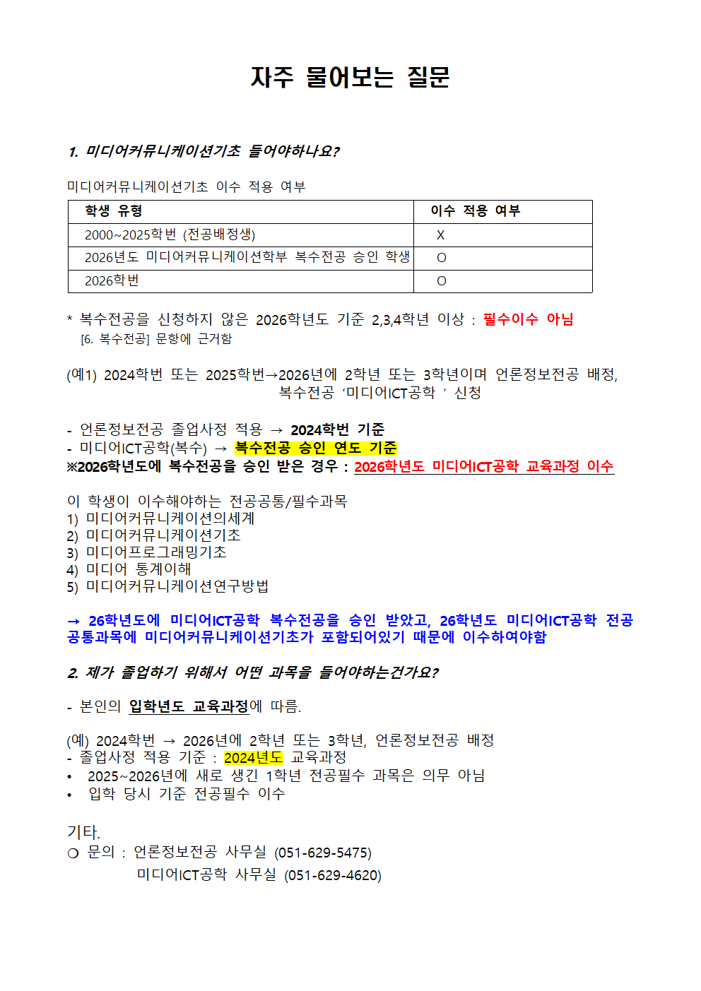 | 첨부파일 | 2026 졸업요건 안내자료_정보융합대학 미디어커뮤니케이션학부 언론정보전공.pdf | ||