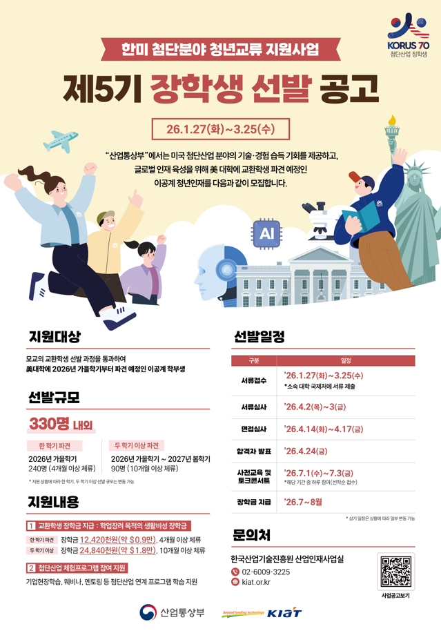 | 2026년도 한미 첨단분야 청년교류 지원사업 제5기 장학생 선발 공고 | |||