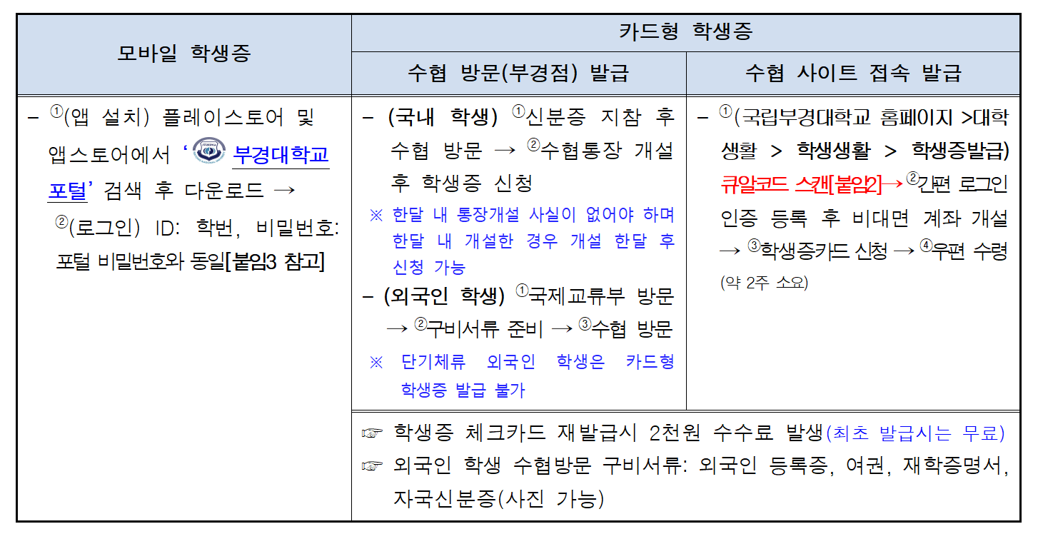 < 국립부경대학교 학생증 발급 안내 > 1. 이용대상 : 국립부경대학교 대학(원) 재학생 2. 발급방법