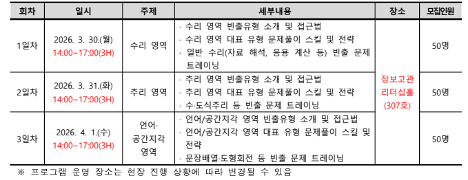 | 2026년 재학생맞춤형고용서비스사업「상반기 대기업 문제풀이(직무 적성검사)」특강 참여자 모집 | |||