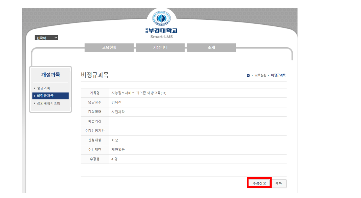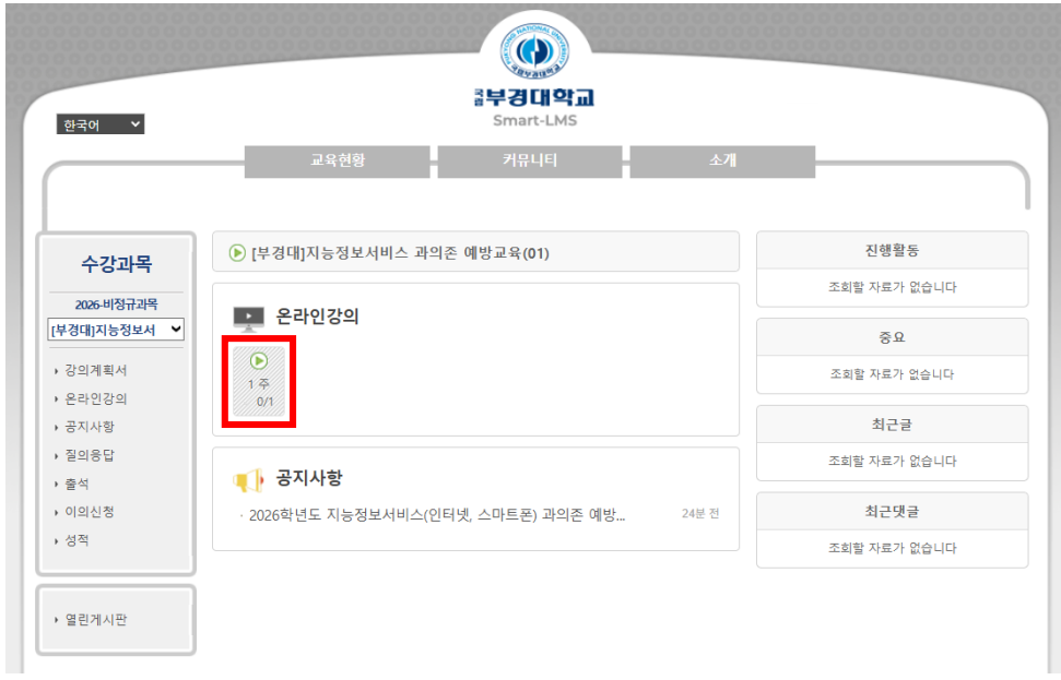<지능정보서비스(인터넷, 스마트폰) 과의존 예방교육 안내> 재학생 의무 이수 교육이오니 아래 방법을 참고하시어 필수 이수 바랍니다. - 교육기간: 26. 3. 30. (월) ~ 10. 30. (금) - 교육방법: 국립부경대학교 Smart-LMS 로그인→교육현황 → 비정규과목 → 지능정보서비스 과의존 예방교육 → 수강신청 → 학습하기