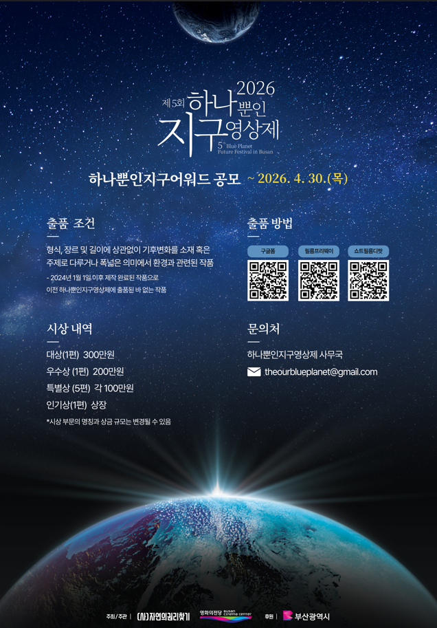 제5회 하나뿐인지구영상제에서 환경·기후를 주제로 한 영상 공모전을 진행합니다. 하나뿐인지구영상제(Blue Planet Future Festival, BPFF)는 2022년 시작된 국제 환경영화제로, 지구환경 문제에 대한 공감과 행동 변화를 이끌어내기 위해 다양한 환경 영상을 발굴·상영하고 있습니다. 환경과 기후를 주제로 한 창의적인 작품을 기다립니다! 학생 여러분의 많은 관심과 참여 바랍니다. ■ 공모개요 1) 공모부문 - 2024년 1월 1일 이후 제작된 작품 - 기후변화 및 환경을 주제로 한 영상 - 형식, 장르, 러닝타임 제한 없음 - 기존 하나뿐인지구영상제 미출품 작품 2) 출품방법 ※ 탄소 발생 최소화를 위해 온라인 접수만 진행 아래 플랫폼 중 선택하여 출품 - 구글폼 https://docs.google.com/forms/d/e/1FAIpQLSeu3RclpgVlO5BJA5iF71VAFUvEvOdMkyTOB5OoyCoYfh5tOg/viewform - 필름프리웨이 https://filmfreeway.com/blueplanetfuture - 쇼트필름디팟 https://shortfilmdepot.com/en/festival/blueplanetfuture 3) 시상내역: 총 8편 선정작 - 대상 (1편) Grand Prize 3,000,000원 - 우수상 (1편) Excellence Awards 2,000,000원 - 특별상 (5편) Special Award 1,000,000원 - 인기상 (1편) Popularity Award Award certificate * 시상 부문의 명칭과 상금 규모는 변경될 수 있음 4) 출품기간: ~ 2026년 4월 30일 5) 최종선정작 발표: 2026년 7월 2일(개별 사전 통지 예정) ■ 유의사항 자세한 공모 내용 및 규정은 하나뿐인지구영상제 홈페이지에서 반드시 확인 바랍니다. 홈페이지: blueplanet.or.kr