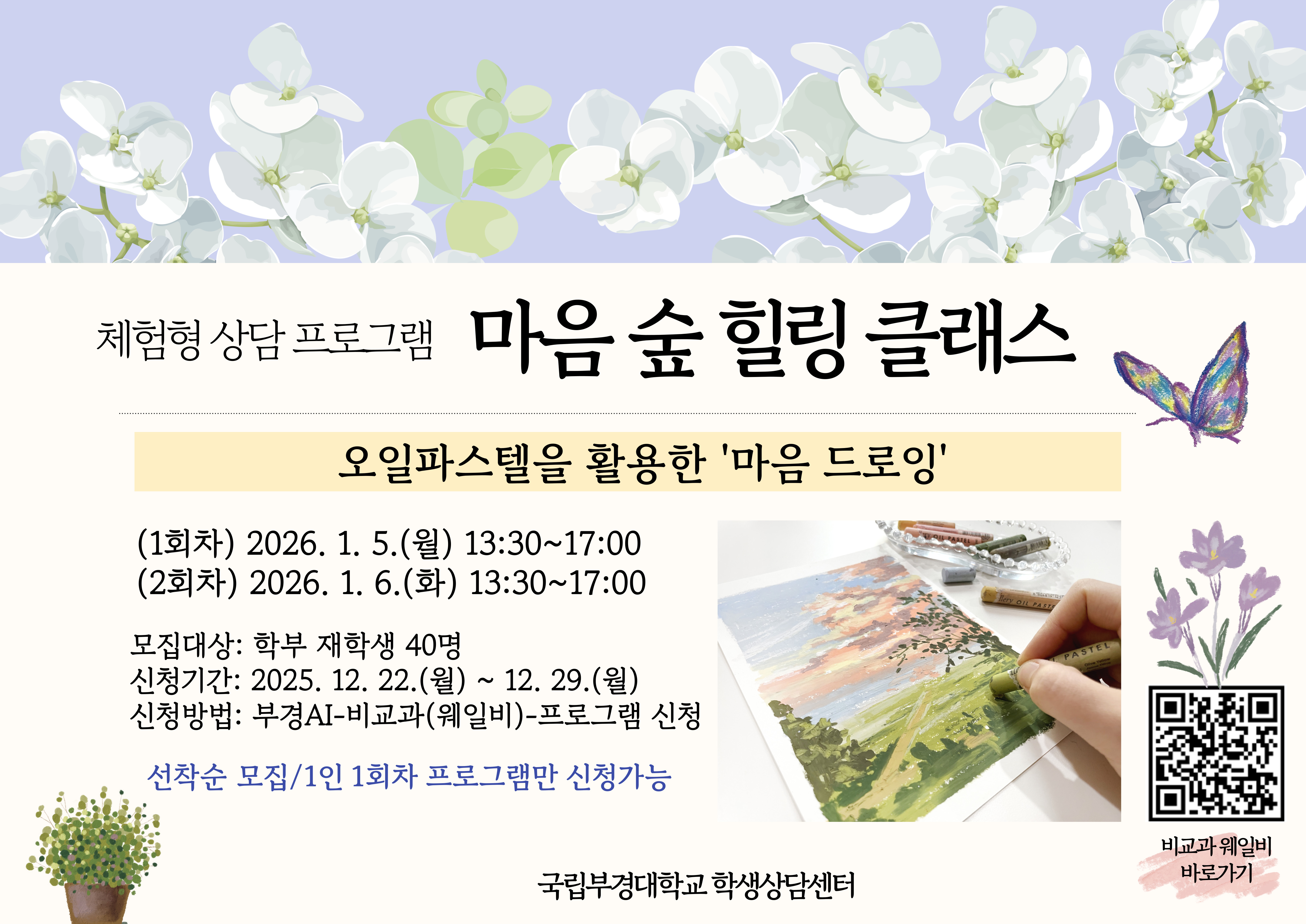 2025학년도 '마음 숲 힐링 클래스' 동계방학편 안내 신청기간: 2025. 12. 22.(월) ~ 12. 29.(월) 신청방법: 부경AI(pknuai.pknu.ac.kr) → 비교과 프로그램 → 프로그램 신청하기 ★ 1인 1회차 프로그램 신청가능(총 2회 중 1회만 신청 가능), 총 40명 선착순 선발★