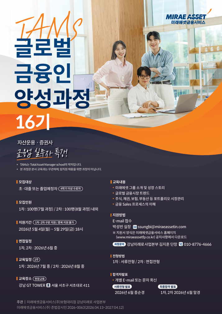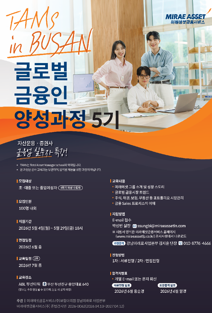 | [미래에셋금융서비스] TAMS 글로벌 금융인 양성과정 16기 & 부산 5기 모집 | |||