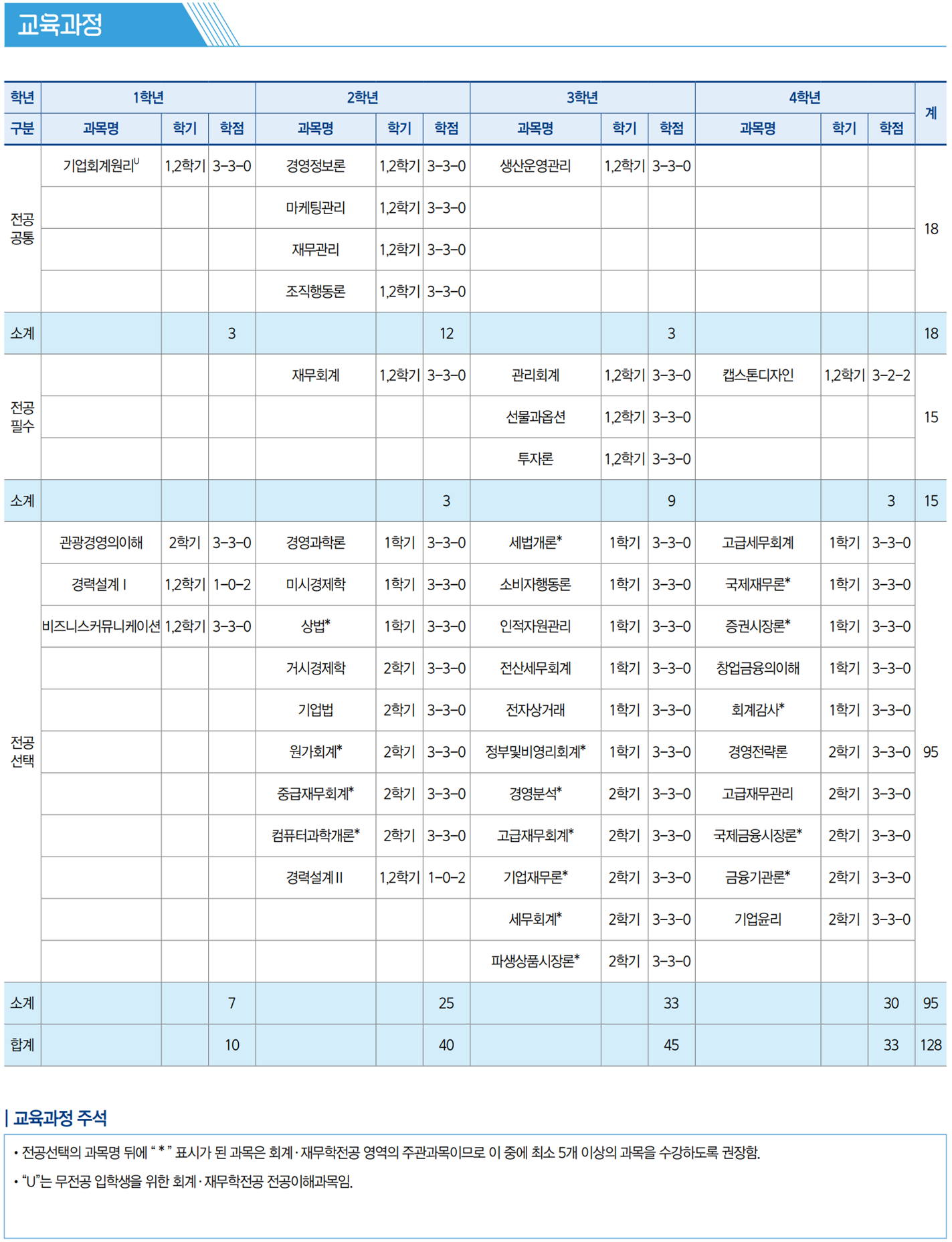 ※ 전공선택의 과목명 앞에 “*” 표시가 된 과목은 회계·재무학전공 영역의 주관과목이므로 이 중에 최소 5개 이상의 과목을 수강하도록 권장함.
