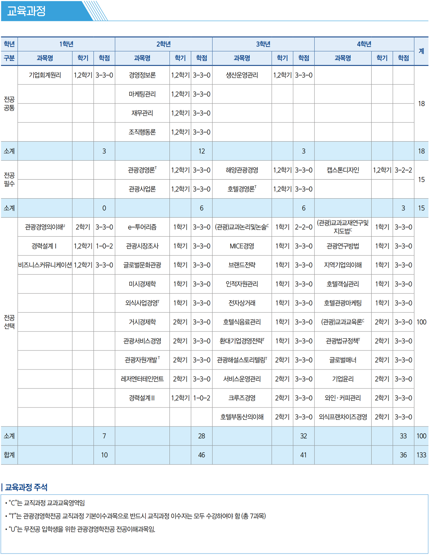 ※ “T” 는 관광경영학전공 교직과정 기본이수과목으로 반드시 교직과정 이수자는 모두 수강하여야 함 (총 7과목)