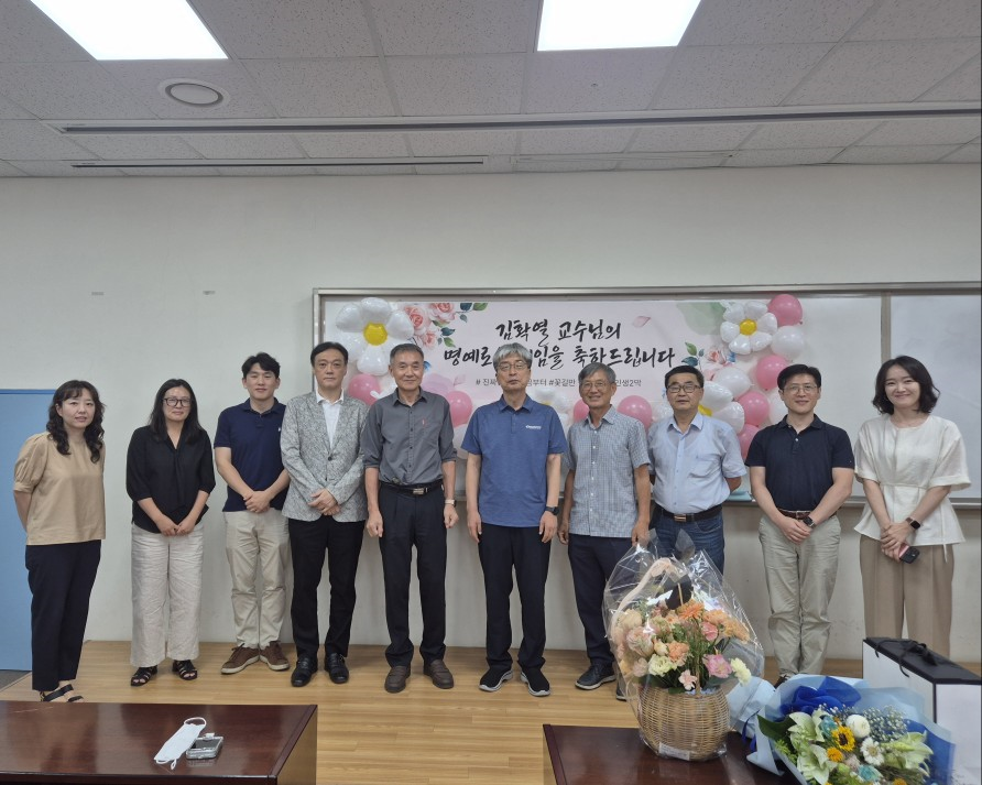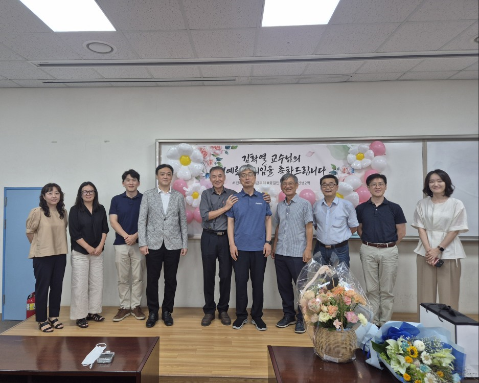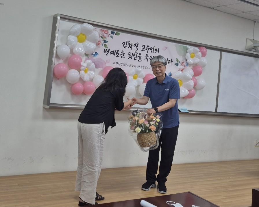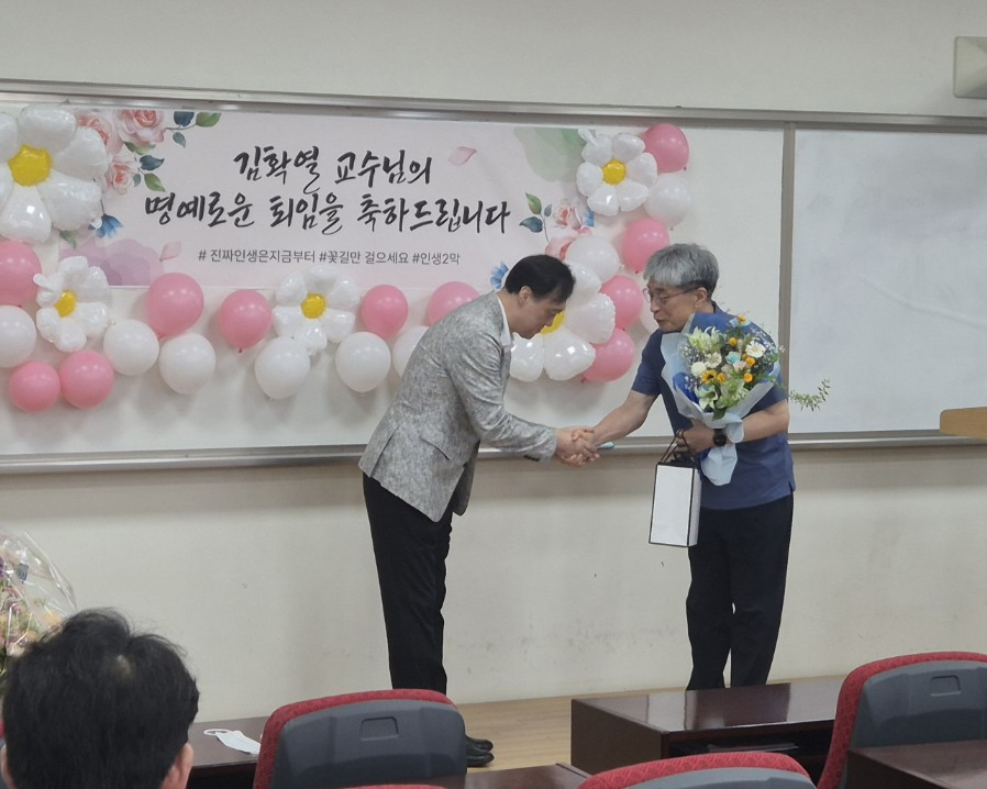 <김확열 교수님 명예퇴임식> 2025년 8월 27일, 본교 발전을 위해 헌신해 오신 김확열 교수님의 명예퇴임식이 진행되었습니다. 강단에서의 열정적인 강의와 깊이 있는 연구로 제자들에게 귀감이 되어주셨던 교수님의 지난 발자취를 되새기는 뜻깊은 시간이었습니다. 비록 교정을 떠나시지만, 교수님께서 남겨주신 학문적 성취와 가르침은 우리 대학의 소중한 자산으로 영원히 남을 것입니다. 새로운 인생의 2막을 시작하시는 교수님의 앞날에 건강과 행복이 가득하기를 기원하며, 그동안의 노고에 깊은 감사와 존경의 마음을 전합니다.