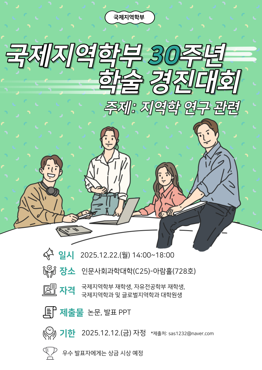 [Announcement: 30th Anniversary Academic Competition of the School of International and Regional Studies] Date: Monday, December 22, 2025, 2:00 PM - 6:00 PM Location: Aram Hall (C25-728), College of Humanities and Social Sciences Eligibility: Current students of the School of International and Regional Studies, current students of the School of Liberal Arts and Sciences, graduate students in the Department of International and Regional Studies and the Department of Global Regional Studies Submission: Short paper, presentation PPT Deadline: By midnight, Friday, December 12, 2025 Submission Address: sas1232@naver.com Cash prizes will be awarded to outstanding presenters. Observers are also welcome. We encourage all |