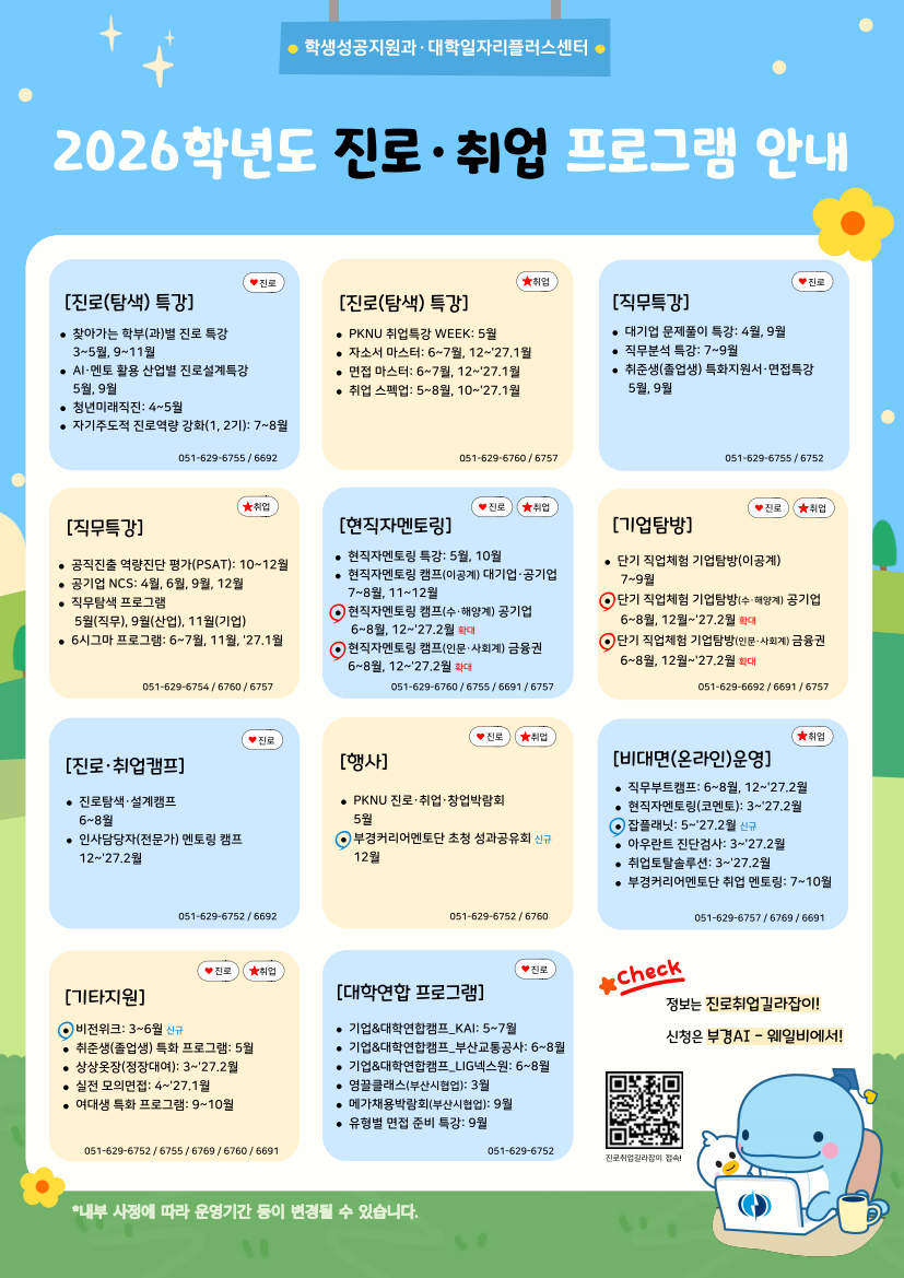 | 첨부파일 | (붙임2) 2026학년도 진로·취업 프로그램 홍보물.pdf (붙임1) 2026학년도 연간 진로·취업 프로그램 안내.pdf | ||