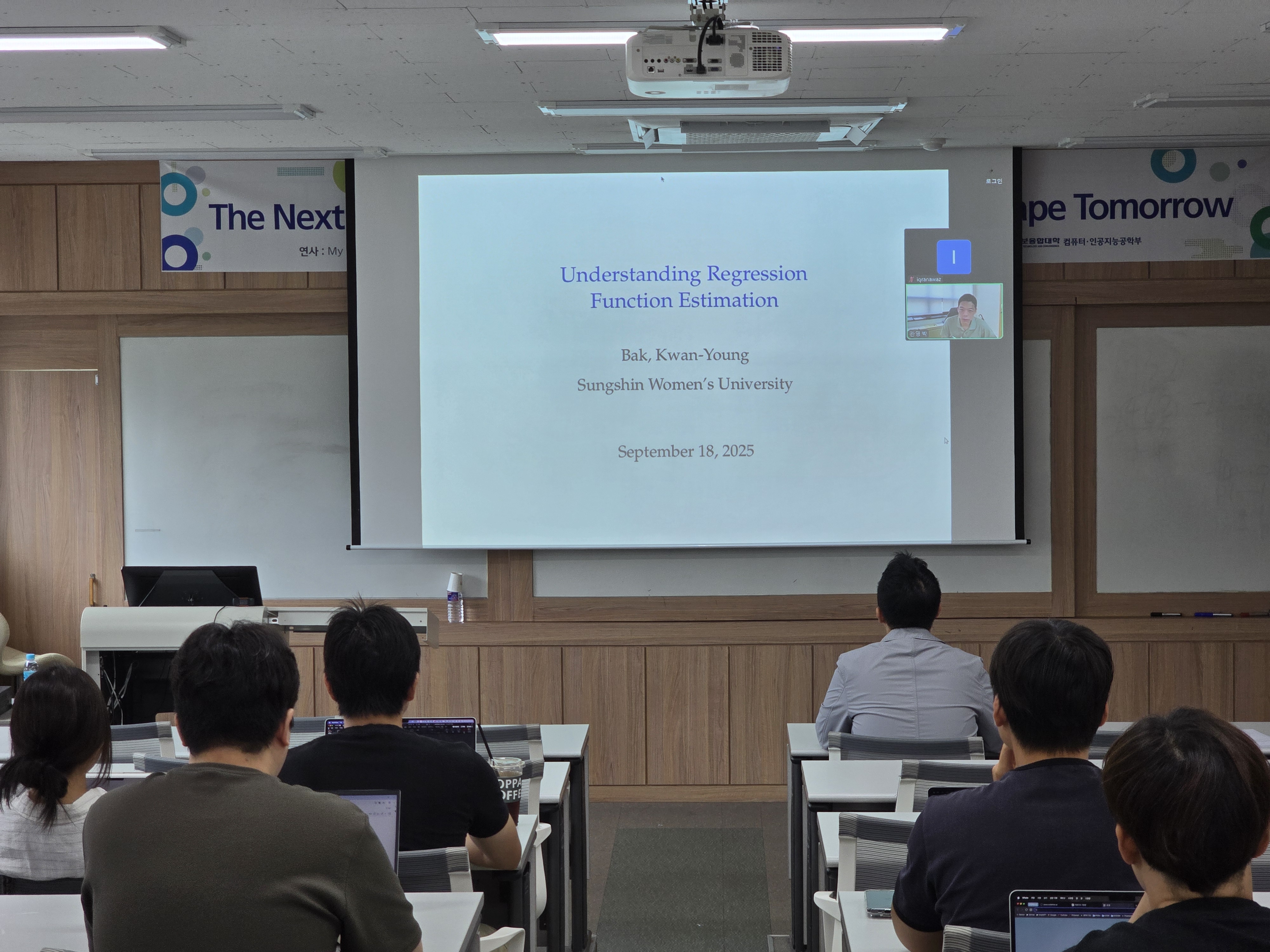 2025년 9월 18일, 국립부경대학교 데이터사이언스융합인재양성사업단 주최로 '회귀 함수 추정의 이해 (Understanding Regression Function Estimation)'를 주제로 한 세미나가 열렸다. 이번 세미나에는 성신여자대학교 통계학과 박관영 교수가 연사로 나서, 데이터 속 관계를 파악하고 미래를 예측하는 통계학의 핵심 방법론인 회귀 분석의 원리를 체계적으로 탐구하는 시간을 가졌다.