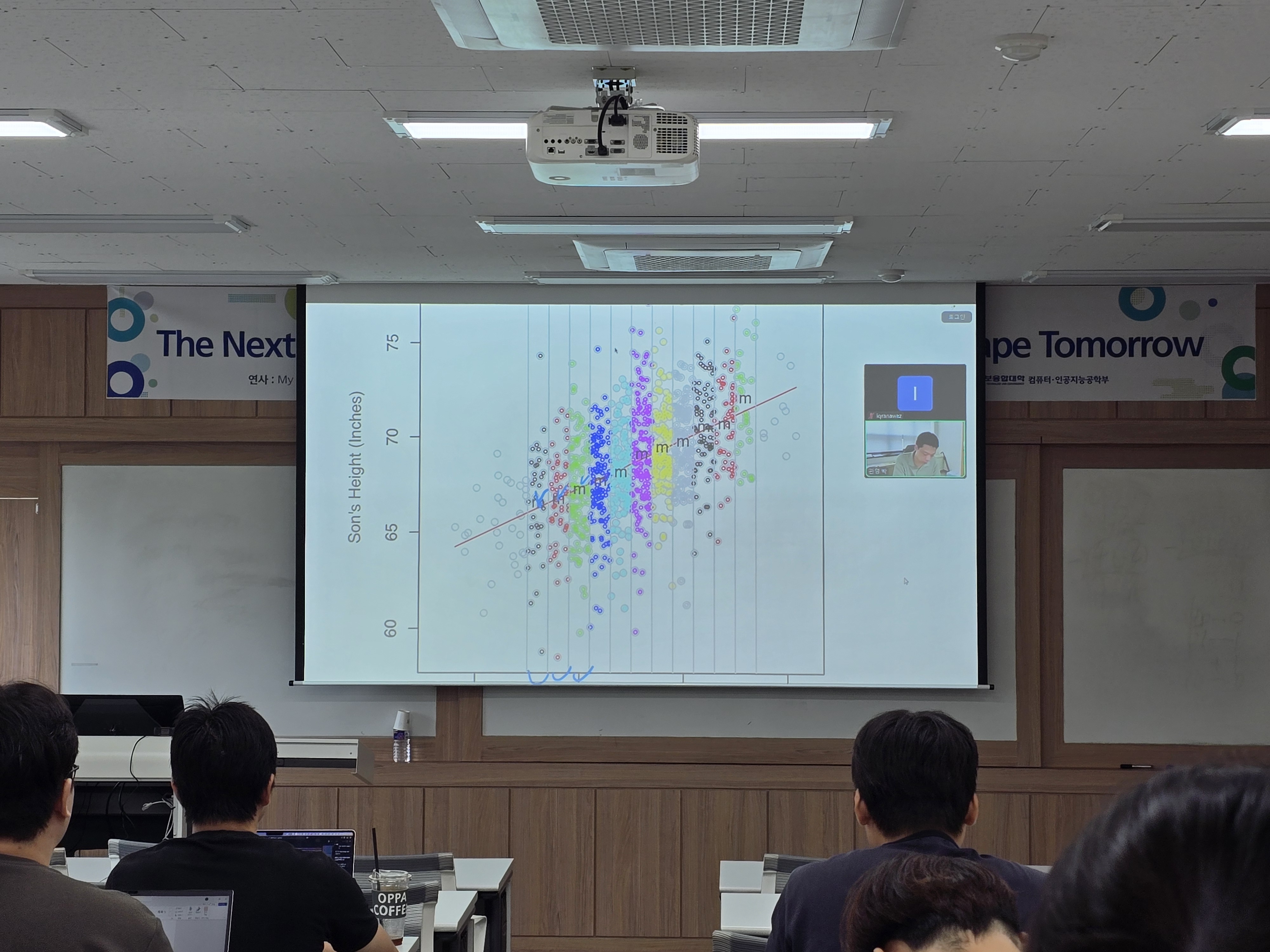 박관영 교수는 골턴(Galton)과 피어슨(Pearson)의 역사적인 키 데이터 연구 사례를 통해 회귀 분석의 근원적 아이디어인 '조건부 기댓값'의 개념을 소개하며 강연을 시작했다. 이를 바탕으로 가장 기초적인 선형 회귀 모형과 최소제곱법(Least Squares Estimation)의 원리를 설명하며, 데이터로부터 의미 있는 관계를 찾아내는 통계적 학습의 목표를 명확히 제시했다.