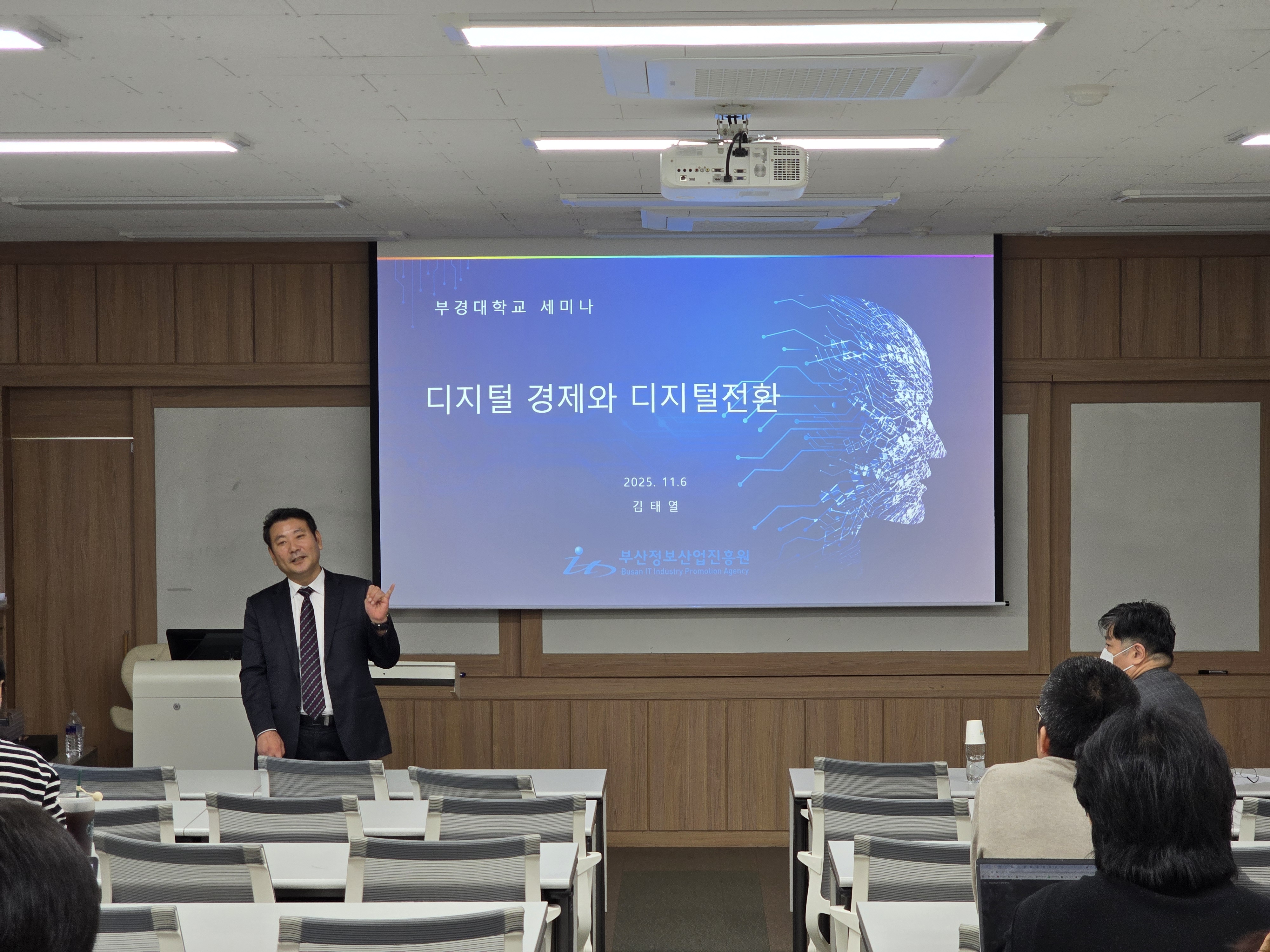 2025년 11월 6일, 국립부경대학교 데이터사이언스융합인재양성사업단 주최로 '디지털 경제 원리 이해' 특별 세미나가 개최되었다. 부산정보산업진흥원 김태열 원장이 연사로 나서, 디지털 경제를 움직이는 핵심 원리를 분석하고 생성형 AI 시대의 새로운 대응 전략을 제시했다.