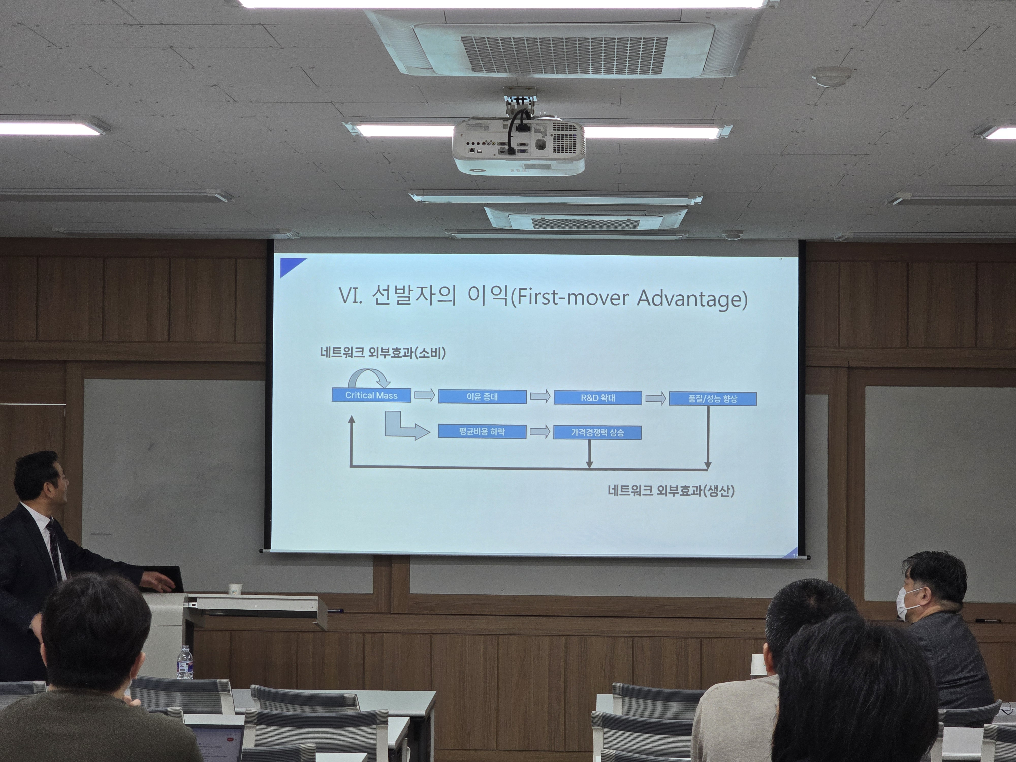 김태열 원장은 먼저 디지털 경제를 구성하는 핵심 원리인 네트워크 효과, 수확 체증의 법칙, 고착 효과 및 플랫폼 경쟁의 기본 개념을 명확히 정의하며 강연을 시작했다. 이어서 이러한 원리 위에서 발생하는 '디지털 전환(Digital Transformation, DX)'의 진정한 의미를 강조했다. 그는 DX가 단순한 기술 도입이 아닌 경영 관리, 프로세스, 비즈니스 모델의 근본적 혁신 관점에서 분석되어야 한다고 설명했다.