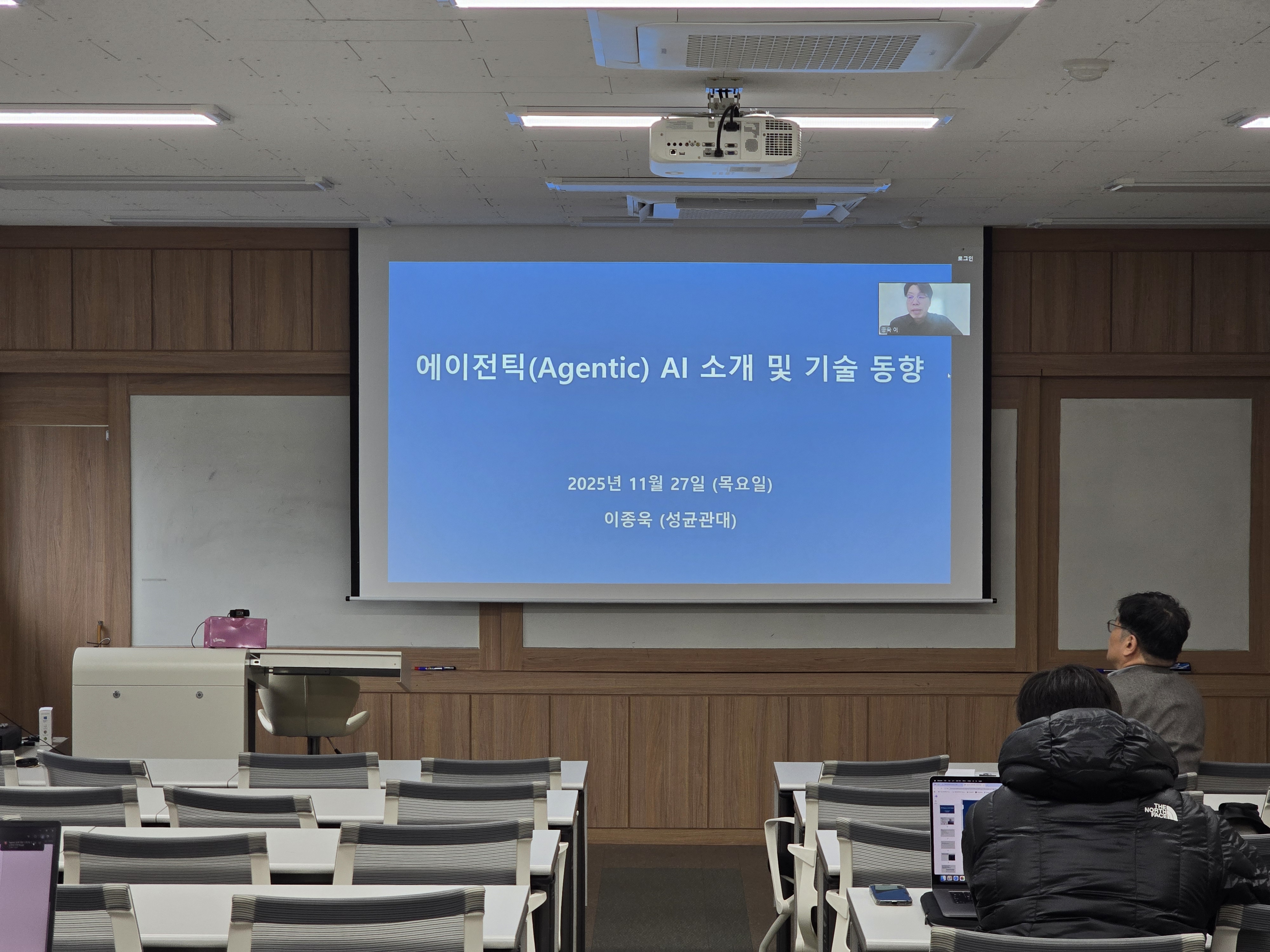 2025년 11월 27일, 국립부경대학교 데이터사이언스융합인재양성사업단 주최로 ‘Agentic AI에 대한 소개 및 기술 동향’ 온라인 세미나가 개최되었다. 성균관대학교 소프트웨어학과 이종욱 부교수가 연사로 나서, 단순한 응답을 넘어 자율적으로 사고하고 행동하는 차세대 AI 시스템인 ‘Agentic AI’의 핵심 기술과 미래 전망을 공유했다.