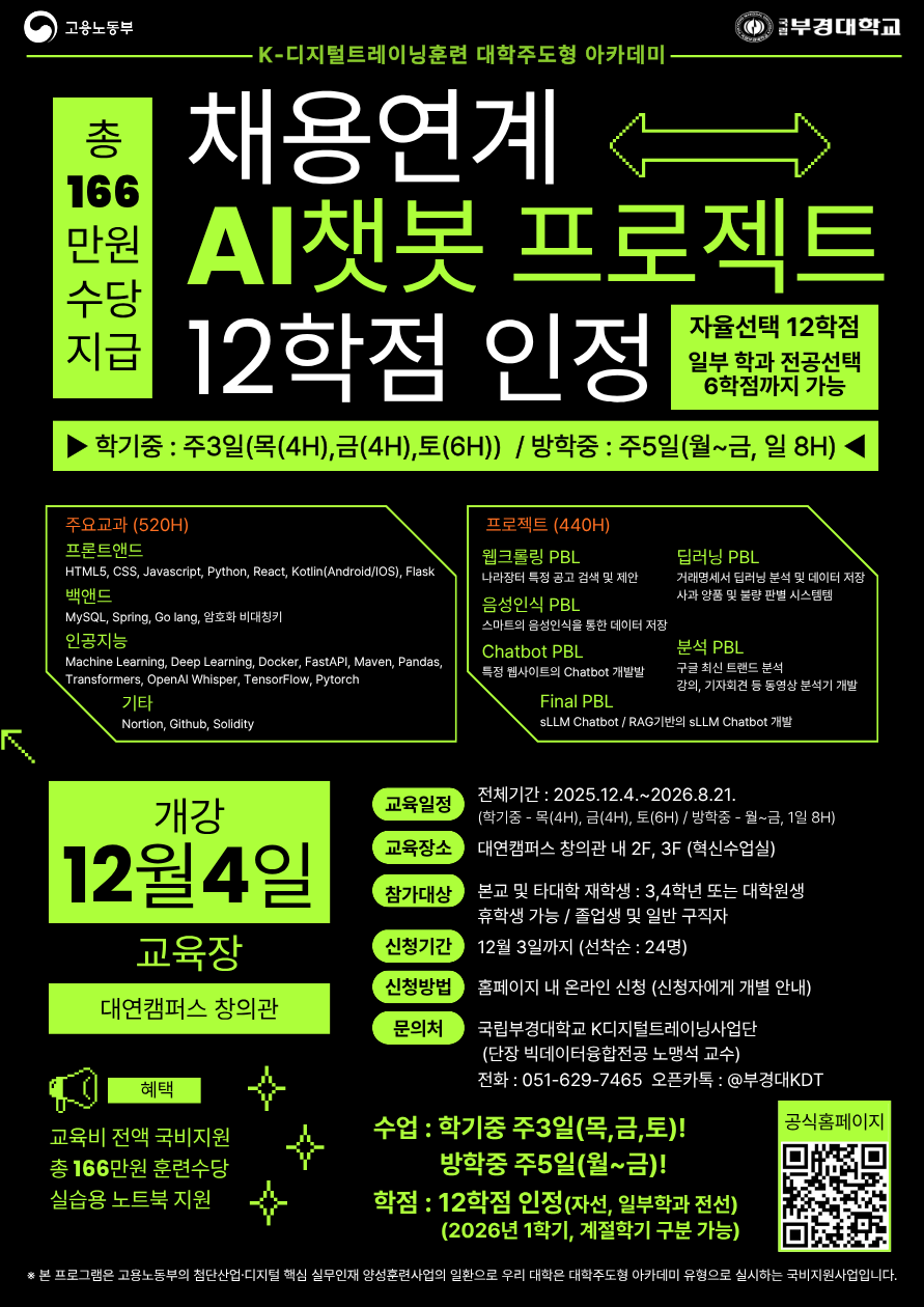 [AI+챗봇개발] 국립부경대 인공지능 블록봇(챗봇) 실무 프로젝트 교육생 모집 1. 훈련과정명 - 인공지능 블록봇(챗봇) 실무프로젝트(3기) 2. 교육기간 및 시간 - 2025.12.4. ~ 2026.8.21. (9개월) - 학기중(대면) : 주3일(목,금,토) - 목,금 15:00~19:00(4H), 토 09:00~15:30(6H) - 방학중(대면) : 주5일(월~금) - 월~금 09:00~17:30(8H) 3. 모집인원 - 24명 4. 교육대상 - 재학생인 경우 3학년부터 가능 (학점교류로 최대 12학점 인정) - 일반인 및 타 대학 졸업생 가능 - 국민내일배움카드발급 대상자 - 프로그래밍 기초가 없어도 신청가능 5. 교육장소 - 국립부경대학교 대연캠퍼스 창의관 6. 혜택 - 실습용 노트북 무상 대여 - 총 166만원 수당지급 - 교재 무상지급 7. 운영기관 - 국립부경대학교 K디지털트레이닝사업단 (빅데이터융합전공 노맹석 교수) 8 지원방법 (택1) - 사업단 홈페이지 수강신청 (https://icms.pknu.ac.kr/kdt) - 구글폼 신청서 작성 (https://url.kr/lgln2e) 9 문의처 - 전화 : 051-629-7465 - 오픈카톡 >> https://open.kakao.com/o/sxsnsJMg - 네이버톡톡 >>https://talk.naver.com/WMOPXT8 |