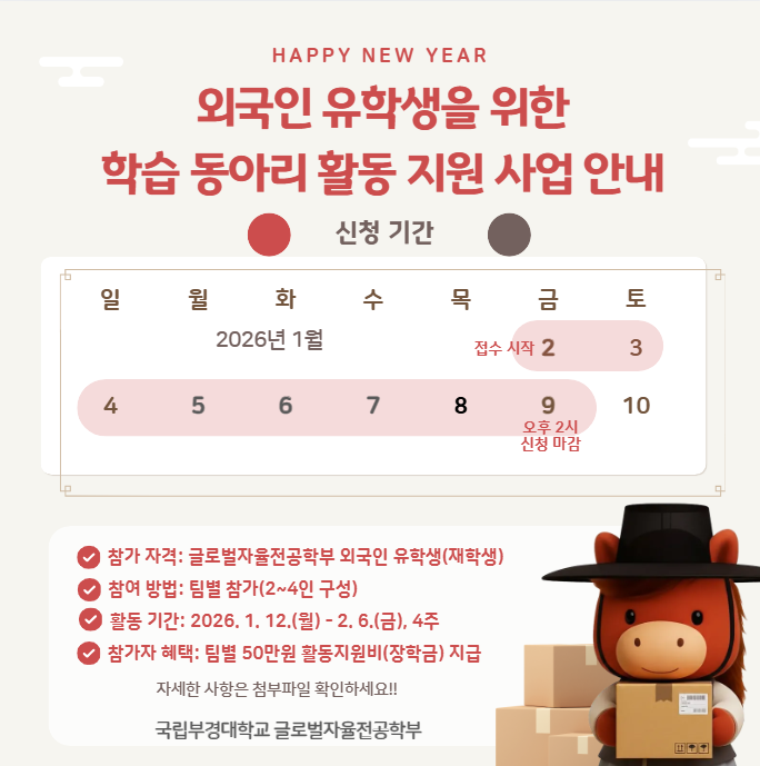 | 첨부파일 | 외국인 유학생을 위한 동계 학습 동아리 지원 사업 안내문.pdf 외국인 유학생 학습동아리 참가 지원서.hwp 외국인 유학생 학습동아리 활동 계획서.hwpx 외국인 유학생 학습동아리 활동 보고서.hwpx | ||