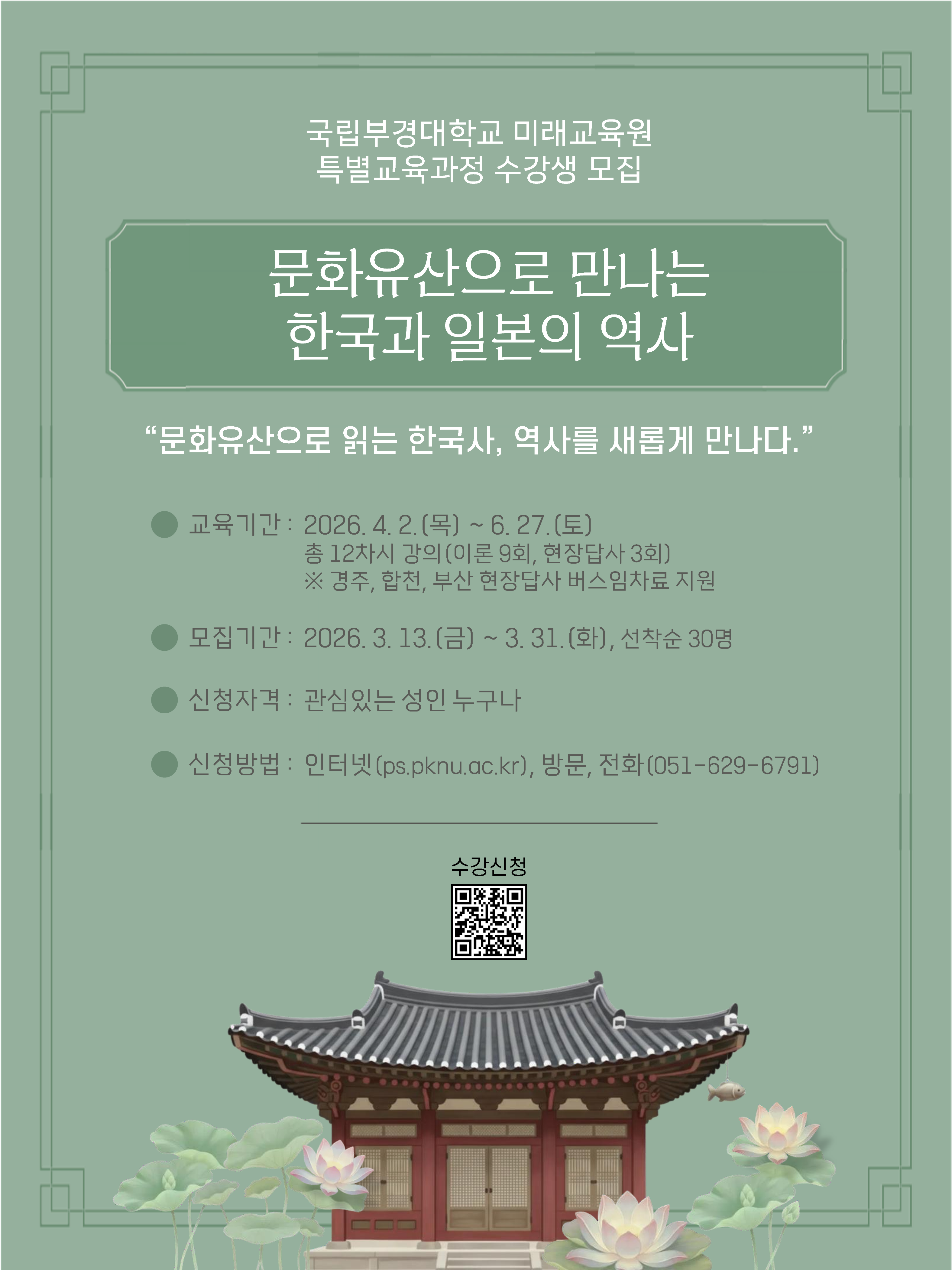 가. 모집강좌: 문화유산으로 만나는 한국과 일본의 역사 나. 모집정원: 30명 ※ (수강생 혜택) 답사 시 버스 임차료 지원, 단 식사비, 입장료 등은 개별부담 ※ (주의사항) 본 과정은 수강료가 저렴하게 책정되어 별도의 수강료 감면 혜택 미적용 다. 모집기간: ’26. 3. 13.(금) ~ 3. 31.(화) 까지 라. 교육기간: ’26. 4. 2.(목) ~ 6. 27.(토), 총 12회(이론 9회, 현장답사 3회) 마. 신청방법: 온라인 선착순 접수(http://ps.pknu.ac.kr), 전화 및 방문 접수 바. 수강료 납부방법 1) 계좌이체: 접수 시 개인별 가상계좌 부여(단, 7일간 유효) 2) 카드결제: 온라인 수강신청만 가능(방문 결제 불가) 사. 문의처: 국립부경대학교 미래교육원 행정실(TEL:051-629-6791, FAX:051-629-6797)
