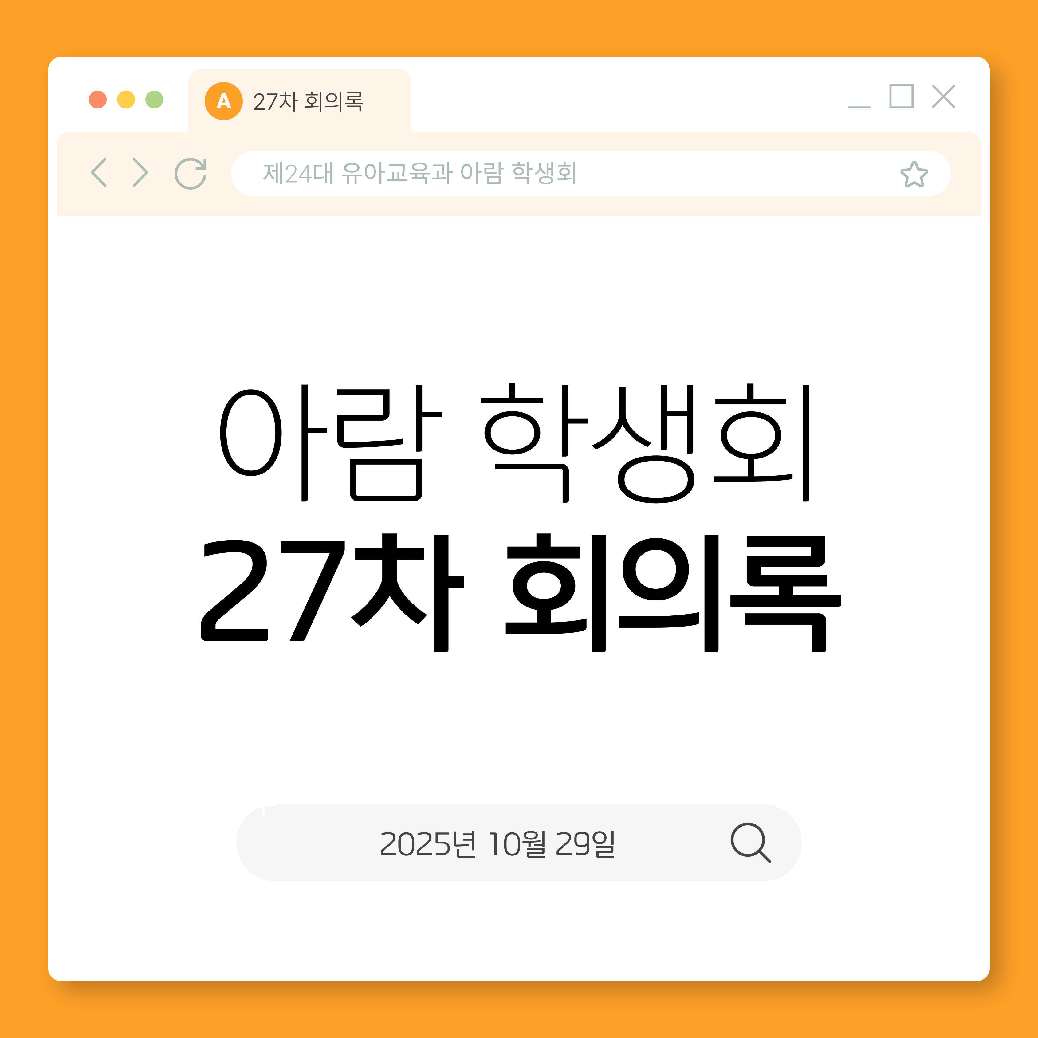 안녕하세요, 아람 유아교육과 학생회입니다! 아람 학생회의 27차 회의록을 공개합니다. 회의록은 부경대 유아교육과 인스타그램을 통해서도 확인하실 수 있으니 참고 바랍니다!