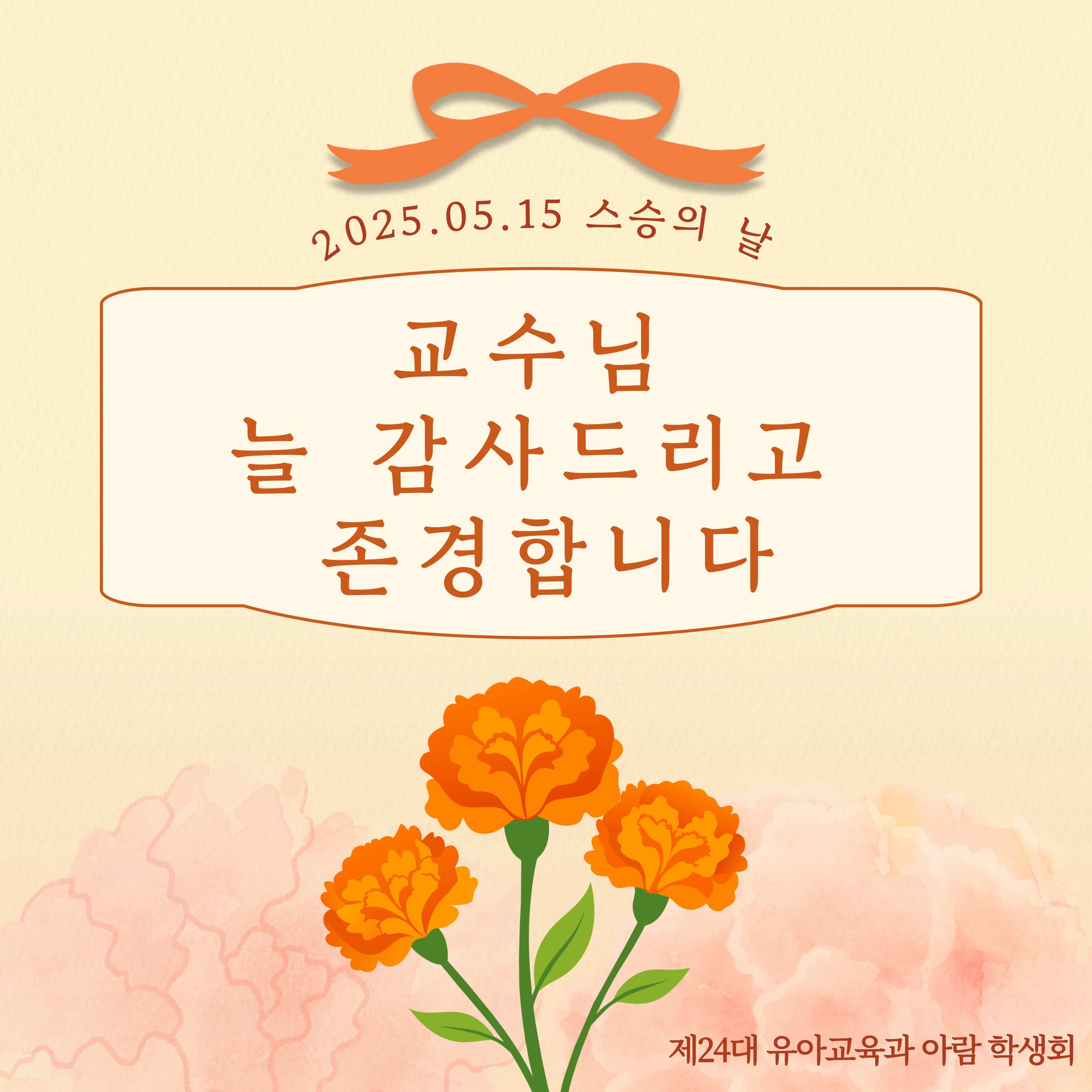 5월 15일 스승의 날을 맞이하여 재학생 대표로 아람 학생회가 유아교육과 교수님들께 롤링페이퍼와 꽃을 전달하였습니다. 선물과 편지를 전달드리며 교수님들과 덕담 한 마디도 나누어보며 훈훈한 시간을 가질 수 있었습니다. 교수님의 따뜻한 지도와 격려 덕분에 유아교육과 학우들이 늘 많이 배우고 성장하고 있습니다. 교수님들께서 항상 유아교육과를 위해 힘내주셔서 늘 감사합니다. 교수님, 사랑하고 존경합니다! |