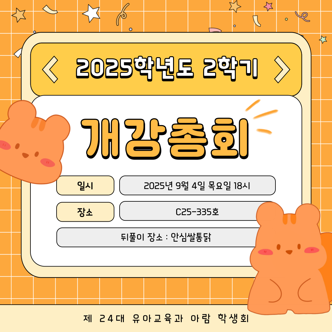 9월 4일, 2025년 2학기를 시작하는 개강총회가 진행되었습니다. 교수님들의 따뜻한 말씀으로 시작하여, 학년보고 및 보고안건 등을 진행하였습니다. 새 학기를 시작하는 2학기의 첫 행사인 만큼 유아교육과 재학생 분들의 많은 참석 덕분에 성공적으로 개강총회를 마무리하였습니다. 2025학년도 2학기도 학교 생활이 활기찰 수 있도록 아람 학생회가 진심을 다해 응원하겠습니다. |