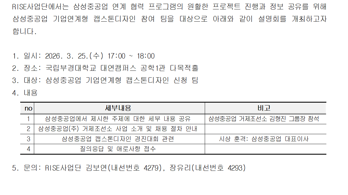2026학년도 1학기 RISE사업단 캡스톤디자인 삼성중공업 연계 협력 프로그램 설명회 개최 안내