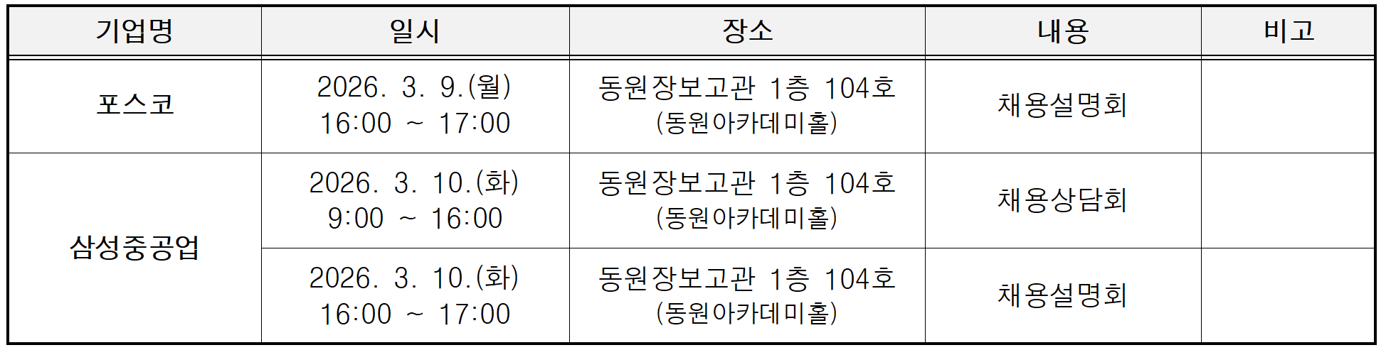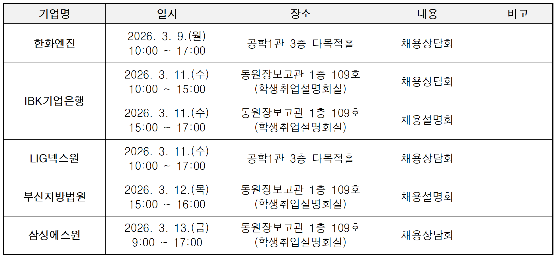 | 첨부파일 | (IBK기업은행)웹공고문.png (LIG넥스원)웹공고문.jpg (부산지방법원) 2026 법원공무원 공개경쟁채용.jpg (삼성에스원)2026 상반기 삼성에스원 3급 신입사원_인턴채용.jpg (삼성중공업) 리플렛1.png (포스코) 공고문.jpg (한화엔진)웹공고문.jpg | ||