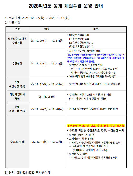 2025학년도 동계 계절수업 개설 희망강좌 수요조사 안내