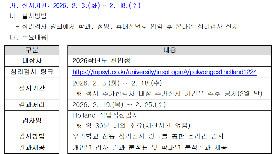 신입생 적성탐색검사 *'대학생활과 진로설계' 수업과 연계되므로 수강생은 필수 참여.