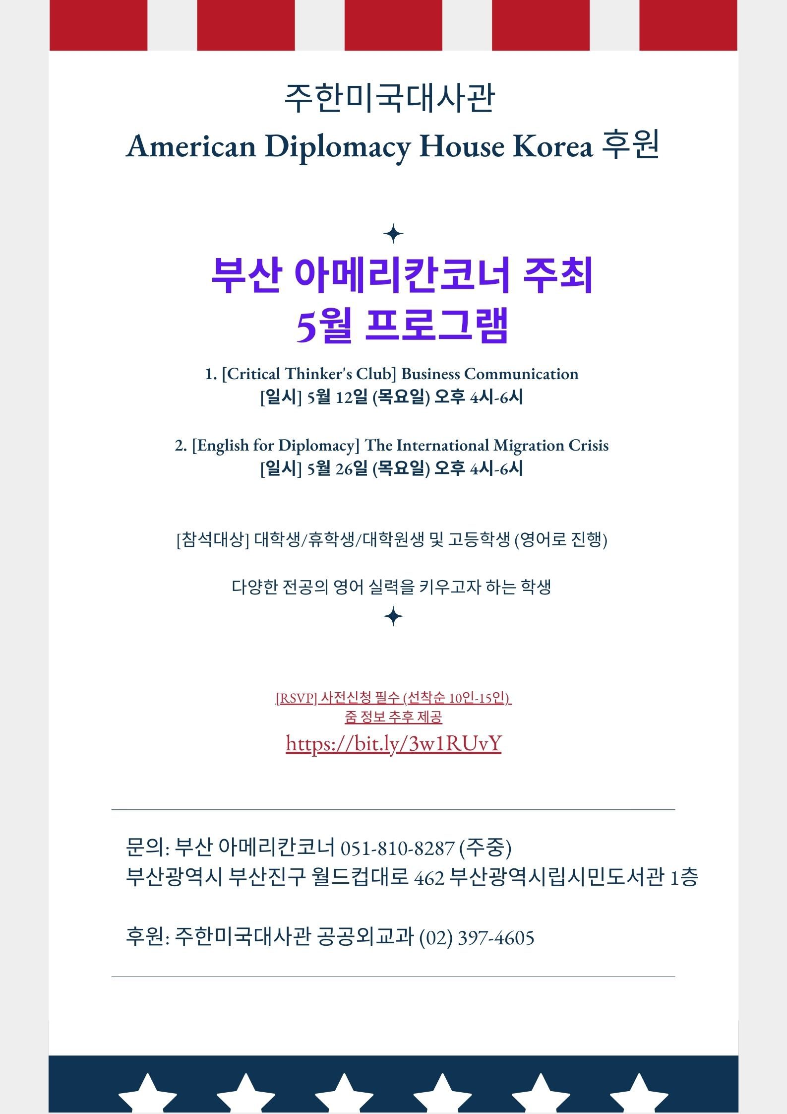 [일시] 5월 12일 (목요일) 오후 4시-6시 / 5월 26일(목요일) 오후 4시-6시 [주제] Business Communication / The International Migration Crisis [연사]Aaron Shayne (주한미국대사관 공공외교과 초청강사) [진행 방법] 화상 연결 (Zoom) / 줌 접속 정보는 추후 행사 하루 전날까지 개별적으로 알려드릴 예정입니다. [참석대상] 대학생/휴학생/대학원생 및 일부 고등학생 (영어로 진행, 영어 토론 가능한 학생)