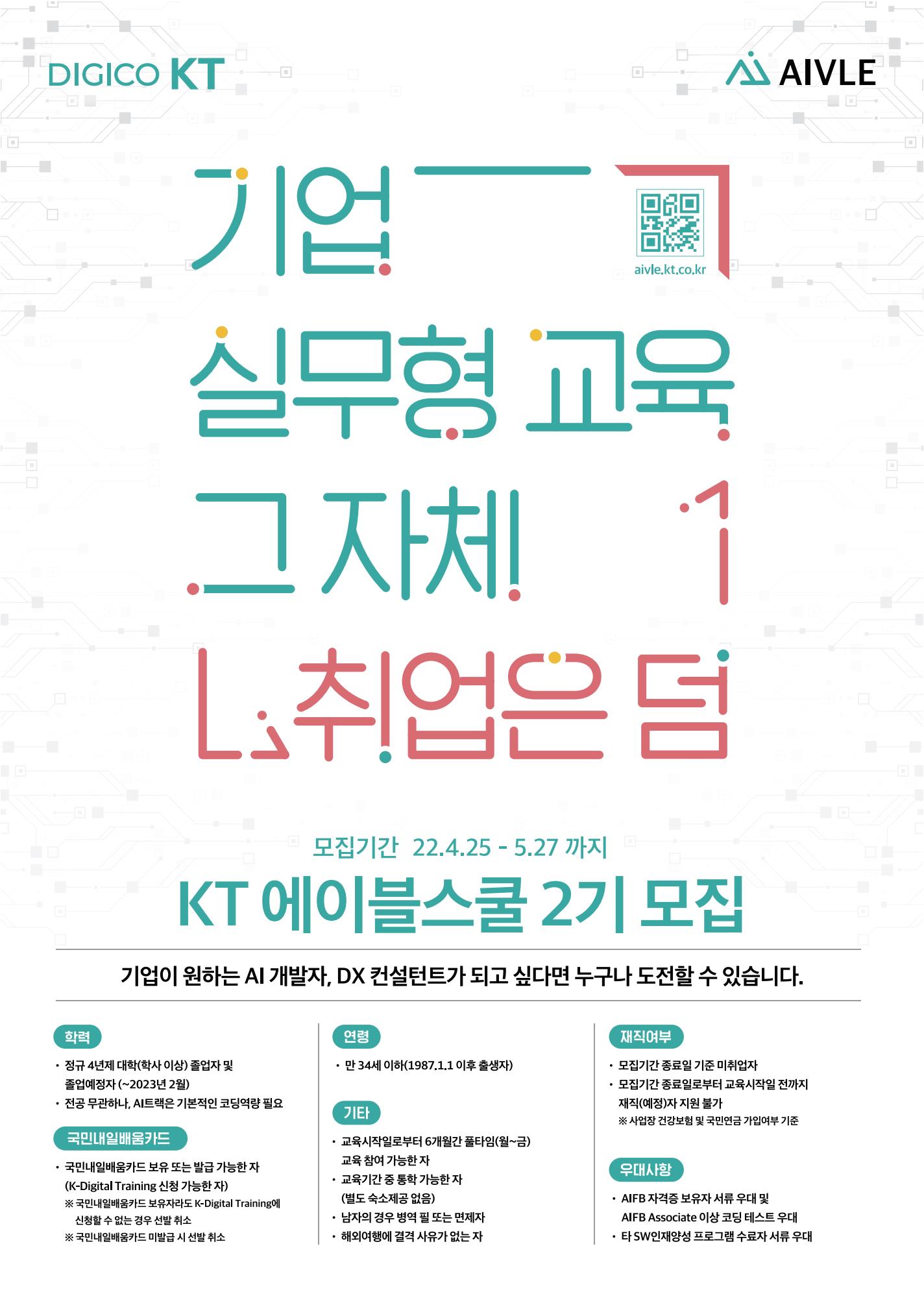 ※ 학교 추천전형 안내가. 추천혜택: KT AIVLE School 교육생 선발시 서류 면제나. 신청방법: 학교추천신청양식을 작성하여 담당자 메일(204456@pknu.ac.kr)로 송부다. 신청기한: ~ 2022. 5. 8.(일) 까지라. 추천인원: 부경대 재적생 또는 졸업생 10명마. 추천기준: 평점평균순으로 선발바. 유의사항: 학교추천전형 신청과 별도로 KT AIVLE 홈페이지(https://aivle.kt.co.kr/)에서 접수신청을 필히 완료하여야 함사. 추천전형 관련 문의: 학생역량개발과 051-629-6691※ 붙임 학교추천신청양식 1부.KT AIVLE School 2기 학교추천신청양식(부경대학교).hwp