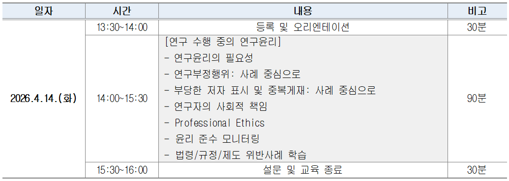 국가과학기술인력개발원(KIRD) 주관 "대학 맞춤형 연구윤리(연구수행 중의 연구윤리)" 교육을 아래와 같이 실시하오니 많은 참여 바랍니다. 1. 일시: 2026. 4. 14.(화) 14:00~16:00(2시간) 2. 장소: 실시간 온라인(ZOOM) 3. 대상: 전임교원 및 대학원생, 연구자 대상(30명 내외) ※ 이수자 기프티콘 제공(인원 30명 초과시, 무작위 추첨을 통해 증정) 4. 교육일정 및 내용: 세부내용 붙임 참조 5. 수강신청: 붙임의 매뉴얼 참조 ▶ 홈페이지(https://alpha-campus.kr) 접속(반드시 크롬으로 접속) → 로그인 → 화면상단(KIRD 스페셜-연구윤리) 클릭 후 → 실시간 원격교육 내 해당과정명 검색 후 수강신청 ▶ ZOOM 링크와 회의 ID, 암호는 수강신청을 완료한 자에게 별도 추가 안내 ▶ 수강신청 기간: 2026. 4. 10.(금)까지 6. 기타사항: 담당자 웹메일(psm223@pknu.ac.kr)로 교육 이수증 개별 제출 ※ 기프티콘 제공을 위해 수료증 제출 시, 이수자의 소속, 성명 연락처 반드시 기재 |